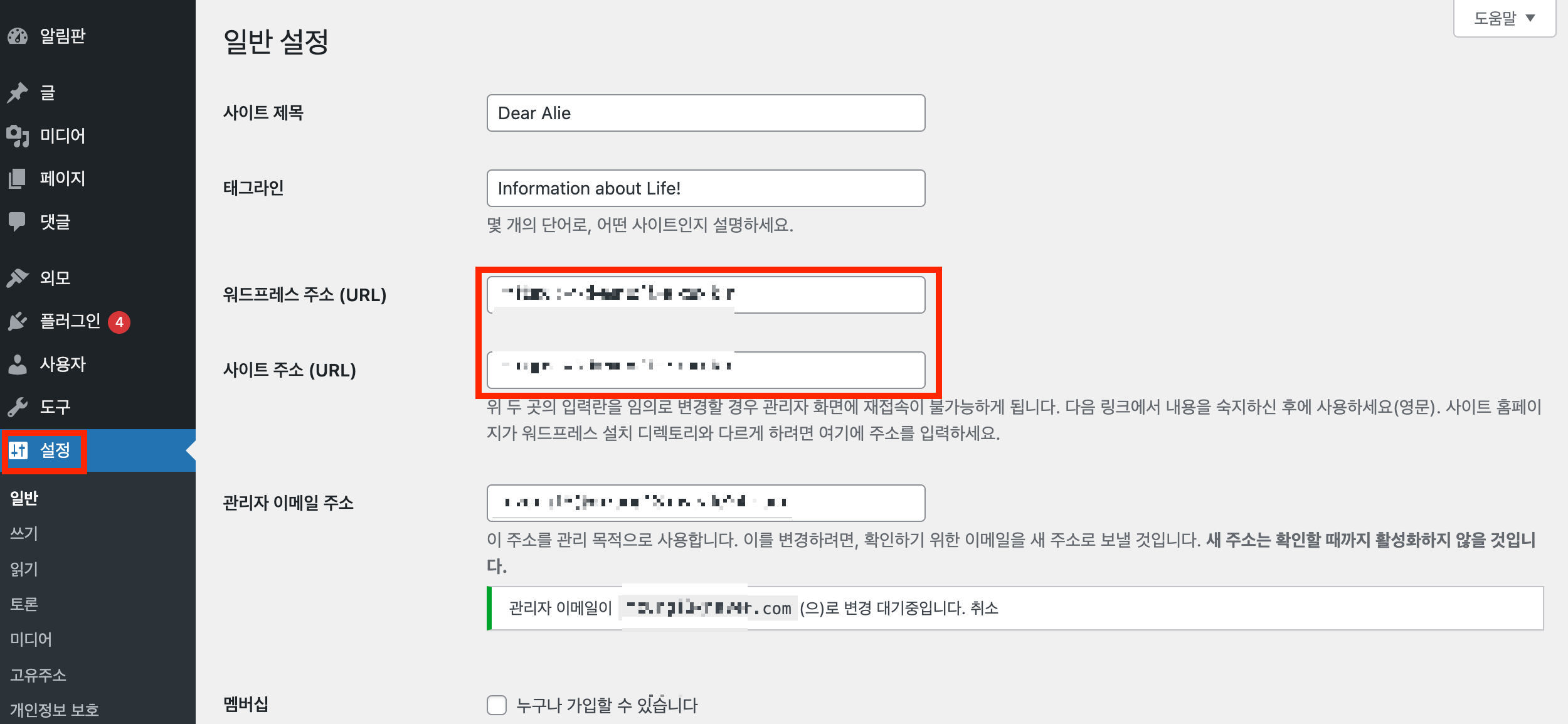 - 설정 - 일반 - 워드프레스 주소 & 사이트 주소 변경