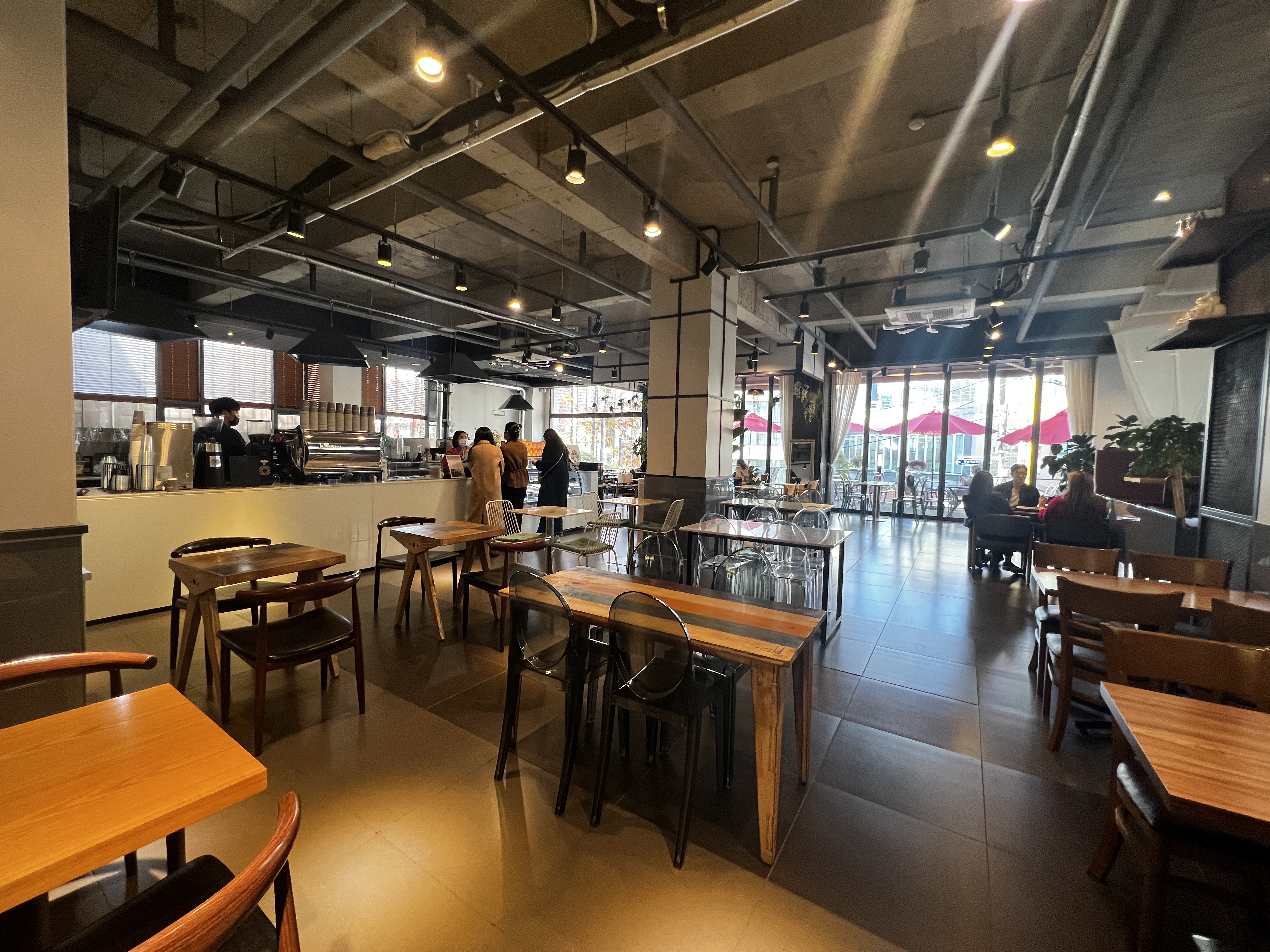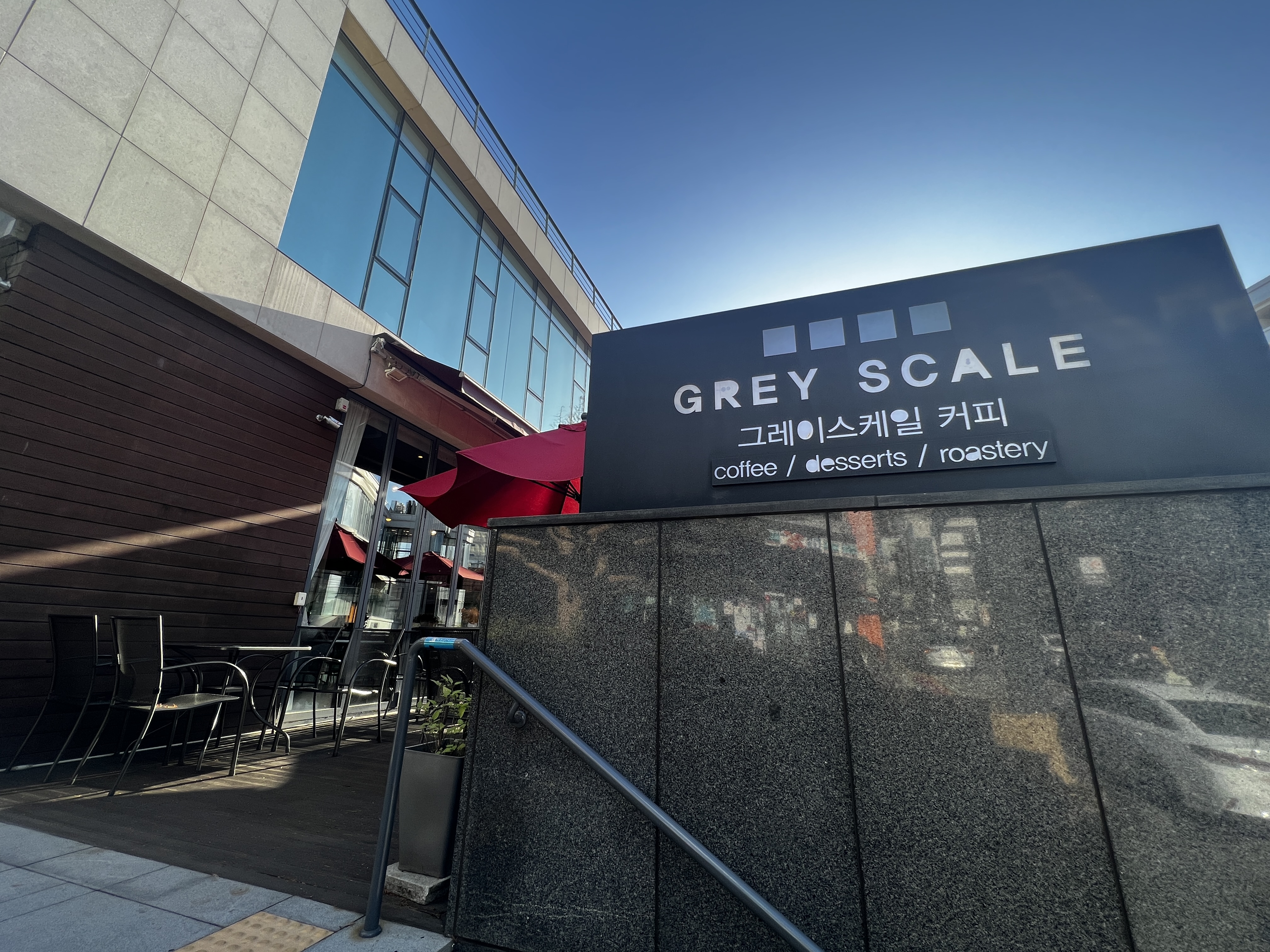 자리를 옮겨 커피를 한잔씩 하는 자리가 너무 멀면 부담이 되기에 바로 앞에 위치한 커피숍, 그레이스케일 커피에 들어가 보았습니다. 점심시간을 막 넘겨서인지 약간 한가한 상태에서 들어갔는데, 조금 지나니 사람들로 북적입니다. 실내가 넓고 창가 쪽은 통유리로 되어있어서 날이 좋은 날 꼭 다시 가보고 싶다는 생각이 들었던 카페였어요. 마초셰프 바로 맞은편에 있습니다.