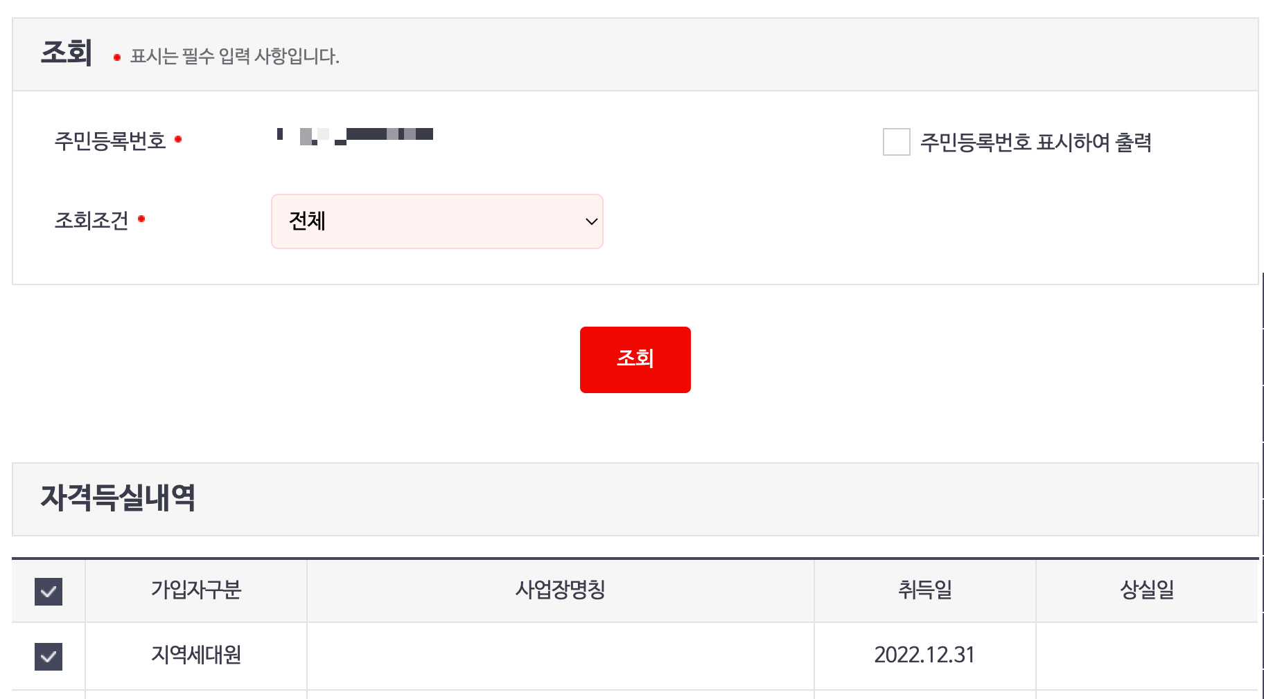 조회를 누르시면 자격득실내역이 나오게 됩니다. 주민등록번호를 포함할지 여부를 선택하신 후, 맨 하단의 [프린트하기]를 누르시면 출력이 가능합니다. 1일 20회 출력이 가능합니다.