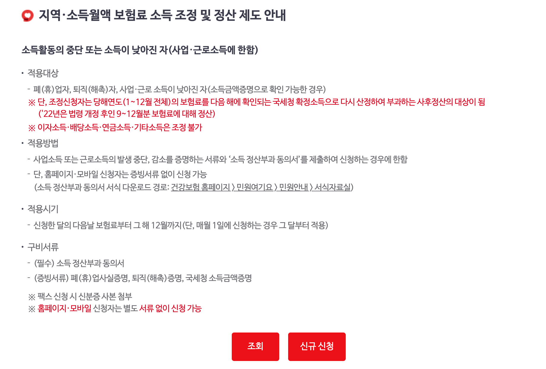 왼쪽과 같이 소득 조정, 정산 신청 및 조회를 누르시면 오른쪽과 같이 신규신청 메뉴가 나옵니다. [신규 신청]을 누르시면 간단히 신청하실 수 있습니다. 문제는 저처럼 직장인 가입자였다가 자동으로 피부양자 등재가 되는 줄 알고 한 달 이상 지나버리는 바람에 그 사이에 보험료가 부과되는 경우인데요. 그럴 경우에는 홈페이지에서 위와 같은 방법으로 신청이 되지 않고 따로 서류를 제출해야 합니다.