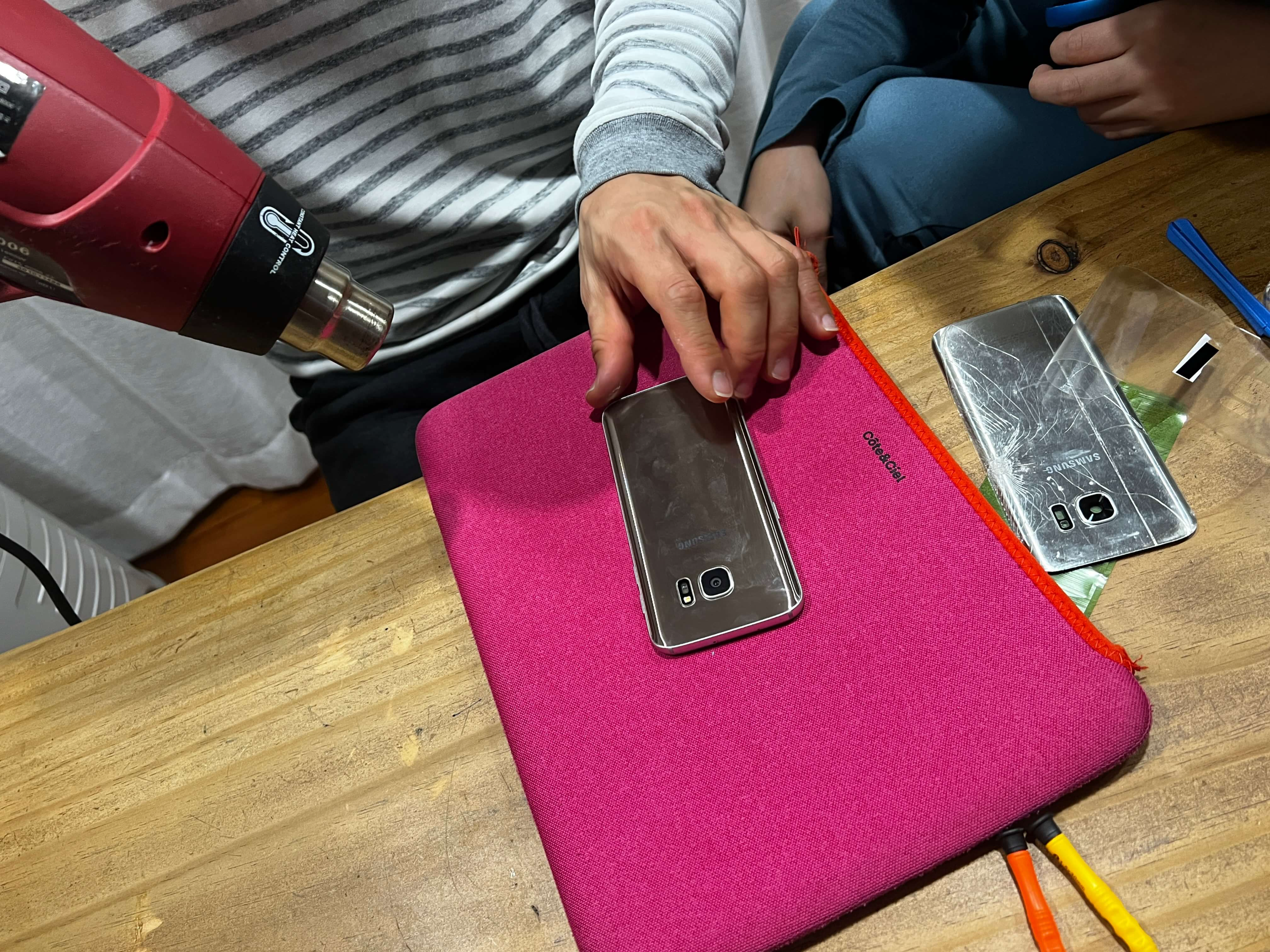 어디선가 히팅건을 꺼내 가져온 저희집 남자들께서 사진찍을 새도 없이 수리를 시작합니다. 뒷판에 열을 가한 후 살짝 들어올리면 뒷판이 떨어져요. 새 뒷판을 붙여준 후 잘 붙으라고 다시 히팅건으로 열을 가해줍니다. 저희집에는 히팅건이 있었지만 없으시다면 드라이기를 사용하셔도 됩니다.