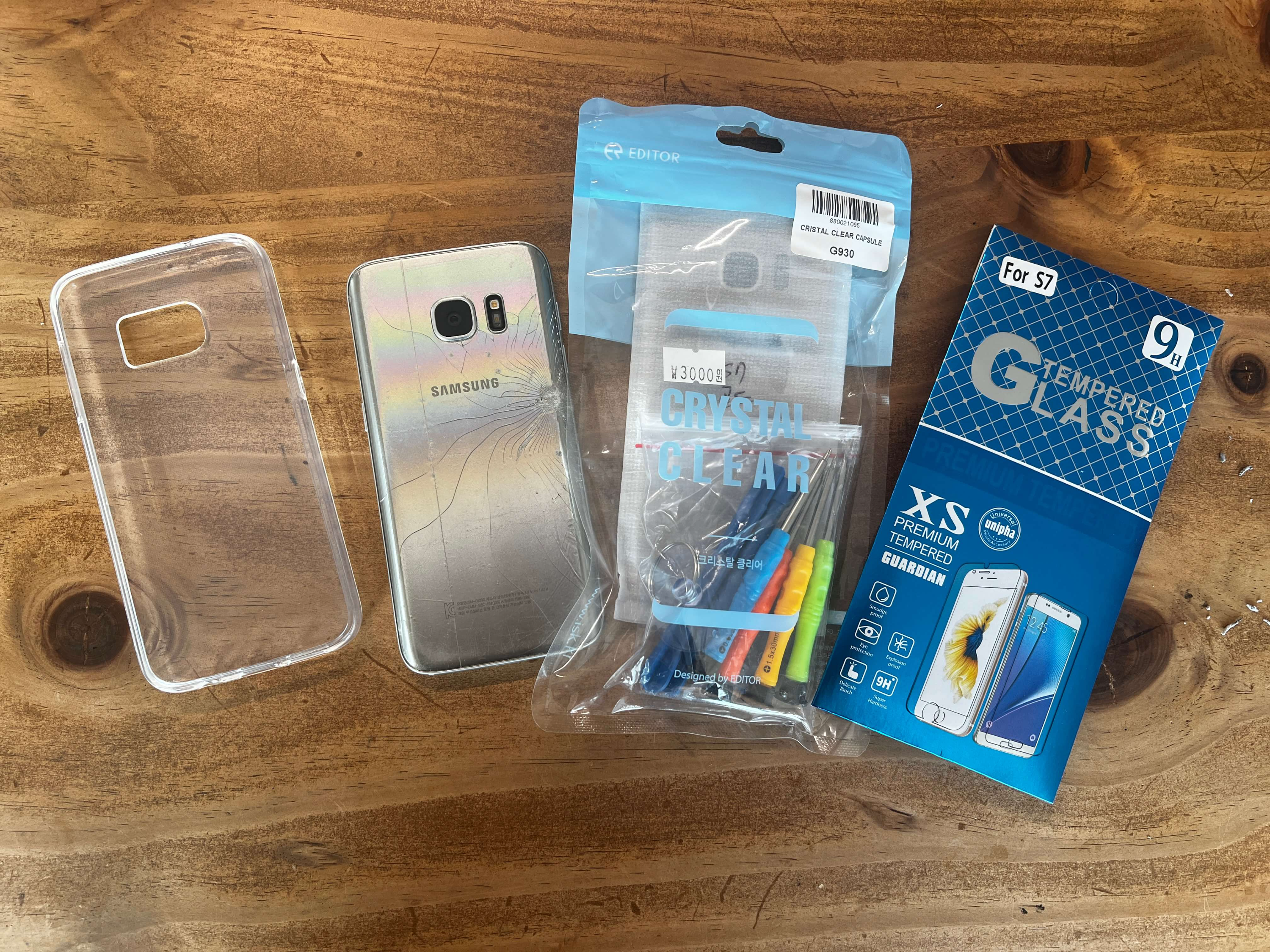 수리키트는 구입할까말까 하다가 구입했는데, 뒷판을 열어보면 작은 나사들이 있어 풀러주려면 구입해야겠더라구요. 수리키트도 3천원, 강화유리 보호필름(비추) 3천원에 투명케이스도 3천원에 구입했습니다. 투명 케이스는 이전에 사용하던 것이 갈색으로 변해서 새것으로 하나 구입해보았네요.
