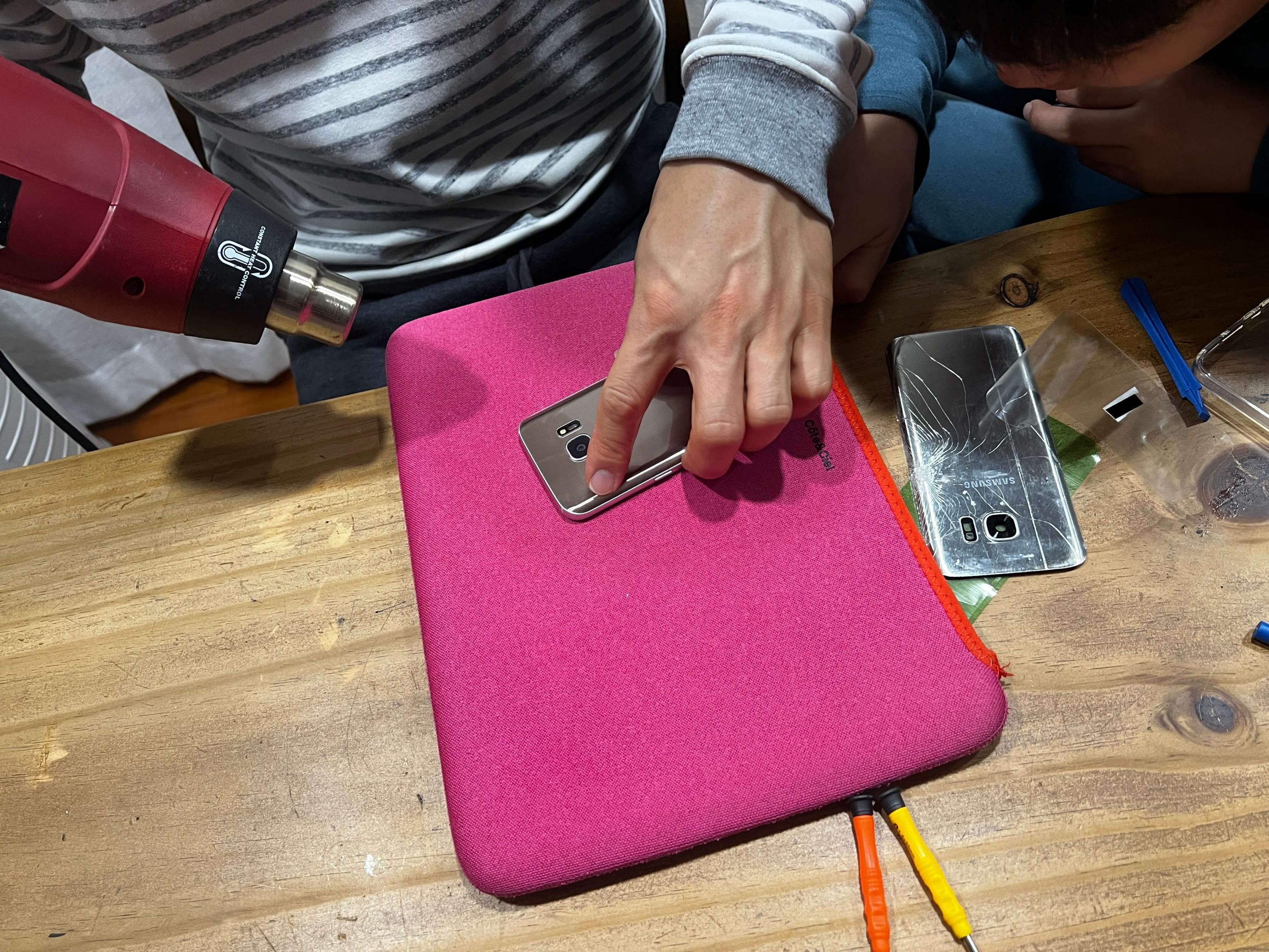어디선가 히팅건을 꺼내 가져온 저희집 남자들께서 사진찍을 새도 없이 수리를 시작합니다. 뒷판에 열을 가한 후 살짝 들어올리면 뒷판이 떨어져요. 새 뒷판을 붙여준 후 잘 붙으라고 다시 히팅건으로 열을 가해줍니다. 저희집에는 히팅건이 있었지만 없으시다면 드라이기를 사용하셔도 됩니다.