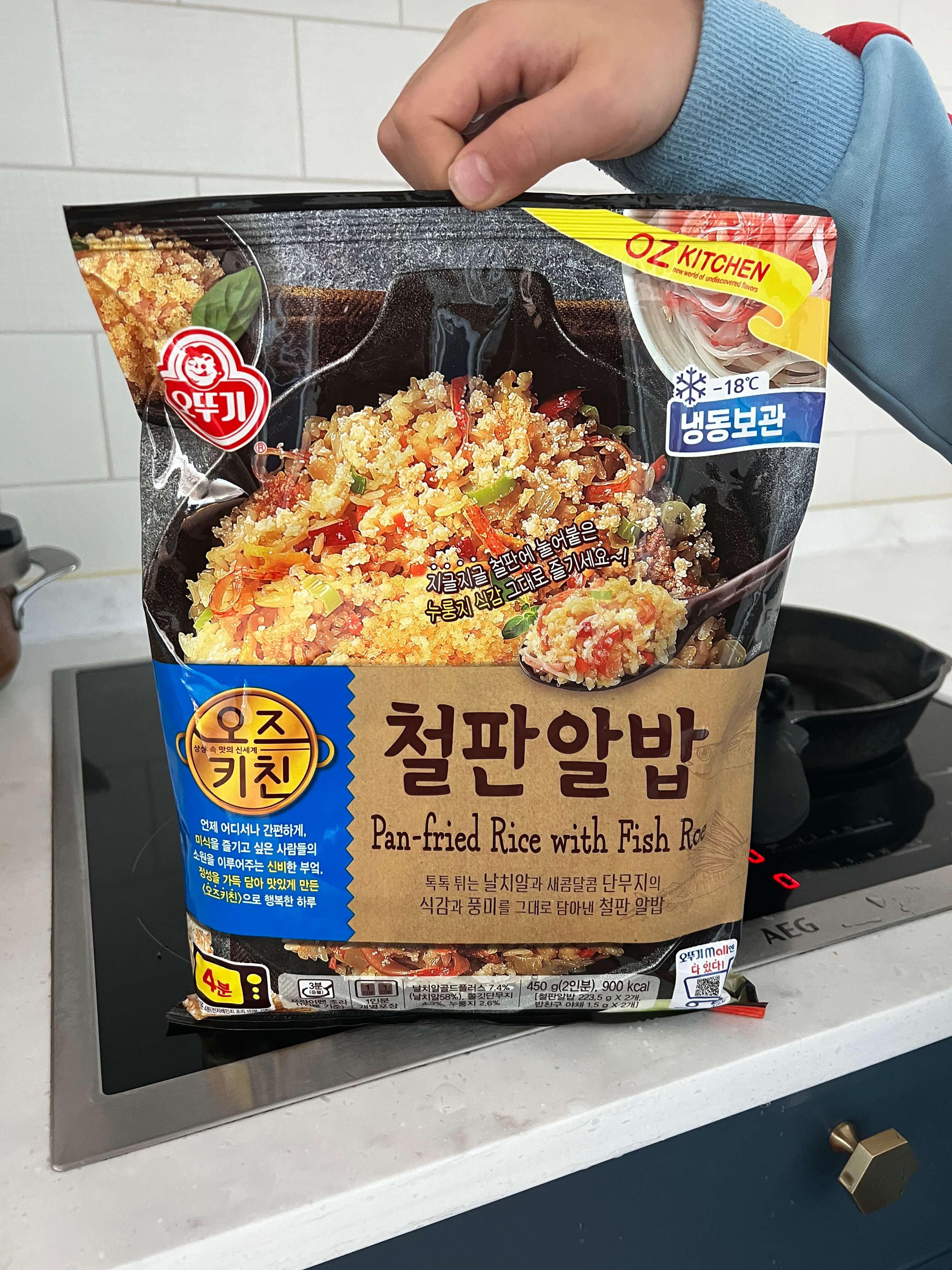 늘 끼니에 맞게 밥도 드셔줘야 하기 때문에 냉동알밥을 하나 샀습니다. 놀러 갈 때나 급할 때 먹으려고 가끔 쟁여두는 것은 코스트코에서 파는 '황금알밥'인데 이번에는 날치알이 들어있다는 철판알밥을 구매해 보았네요. 맛은 그럭저럭 괜찮습니다. 2 봉지가 들어있는데 한 끼에 끝납니다. 초등학생 많이 먹는 남자아이들 기준으로는 1 봉지를 모두 볶아도 살짝 모자란 감이 있기에 계란프라이 하나 살짝 해서 올려주었더니 잘 먹네요.