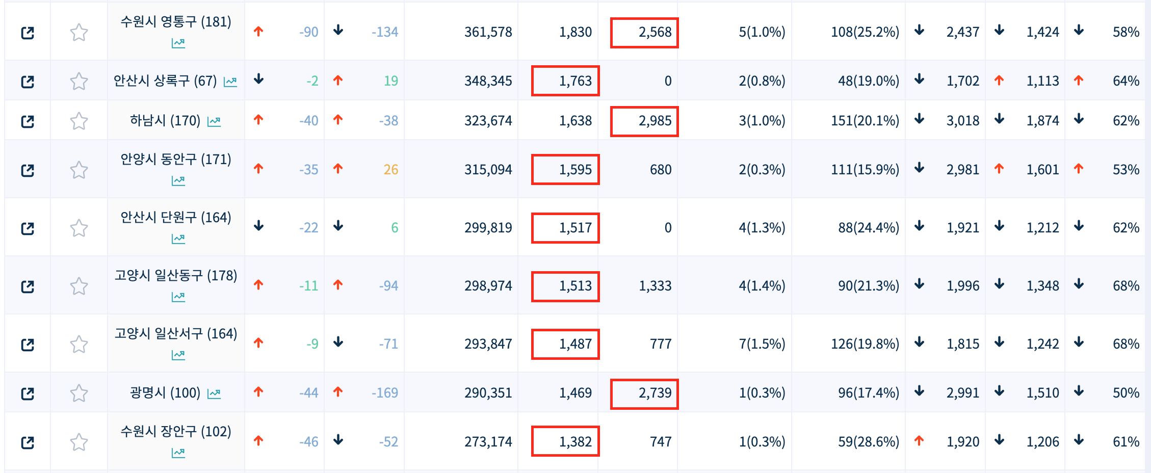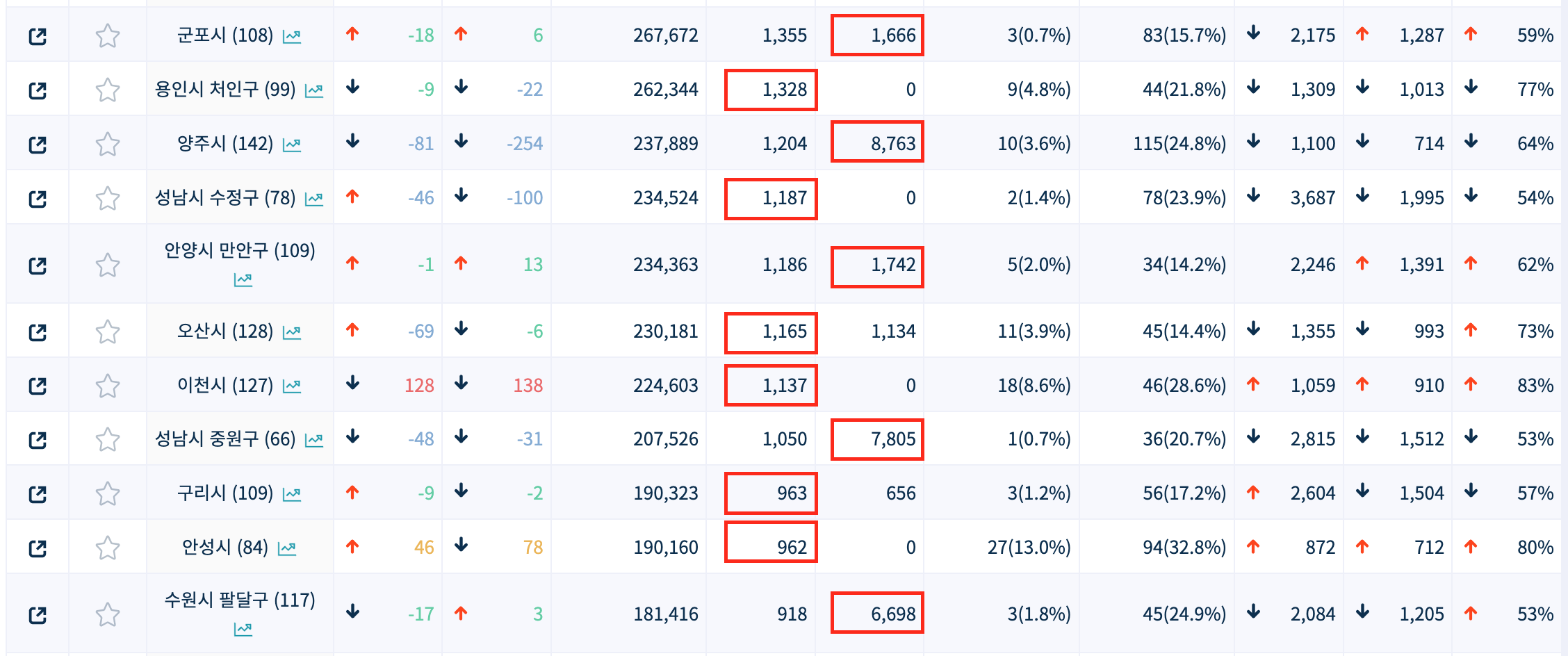 수요보다 공급이 더 많은 지역보다는, 수요가 공급보다 더 많은 지역을 한번 살펴보니 꽤 되네요. 이 중, 수요는 있는데 공급은 0인 지역을 위주로 살펴보니 기흥구(용인시), 상록구(안산시), 단원구(안산시), 처인구(용인시), 수정구(성남시), 이천시, 안성시, 의왕시, 동두천시가 있습니다.