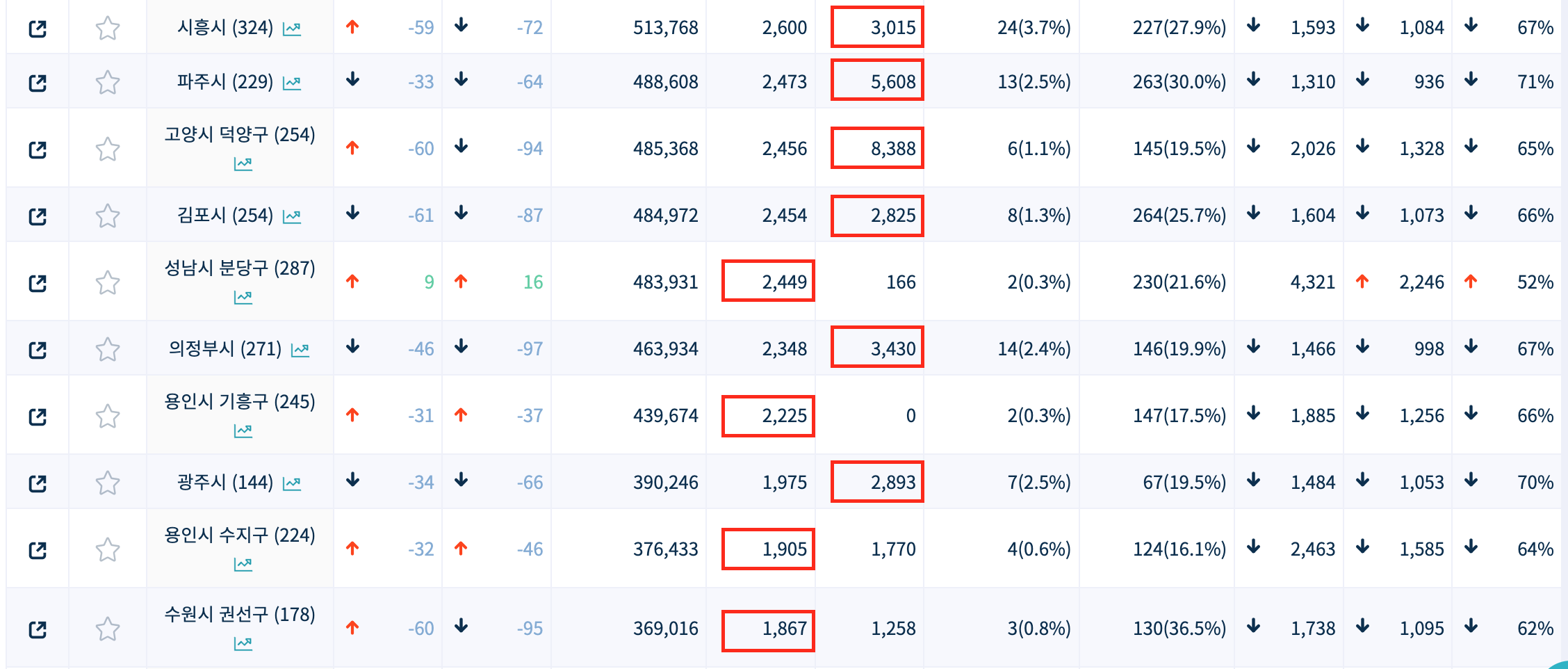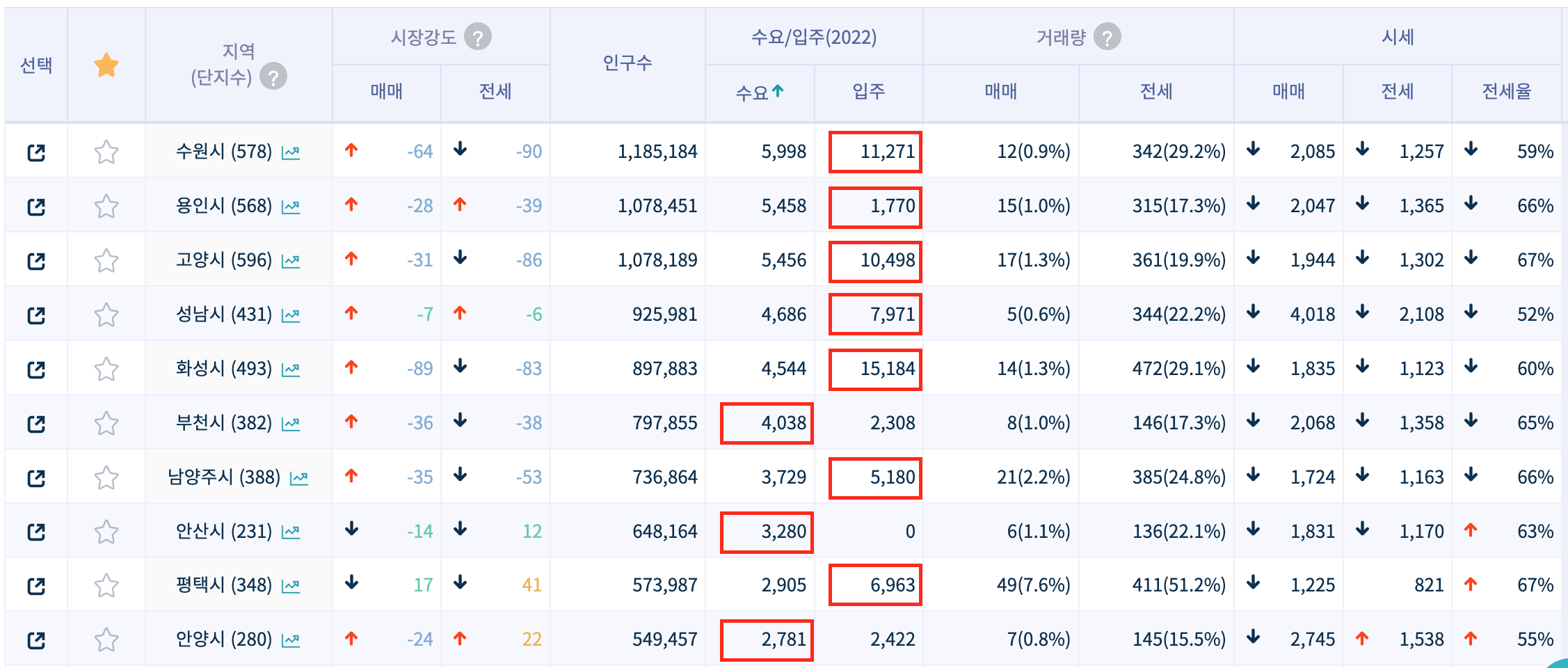 수요가 높은 순으로 정렬해보았을 때, 일단 수원시, 용인시, 고양시, 성남시, 화성시가 TOP 5로 수요가 높습니다. 다만 TOP 5 중 용인시를 제외하고는 수요물량보다 입주물량이 더 많은 상황입니다.