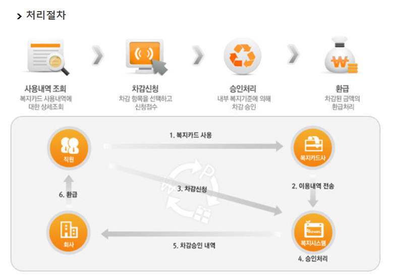 일단 복지몰에 접속합니다. '나의 복지'에 접속한 후, 왼쪽 하단 '기타 카드'에 '차감 신청'을 선택합니다.