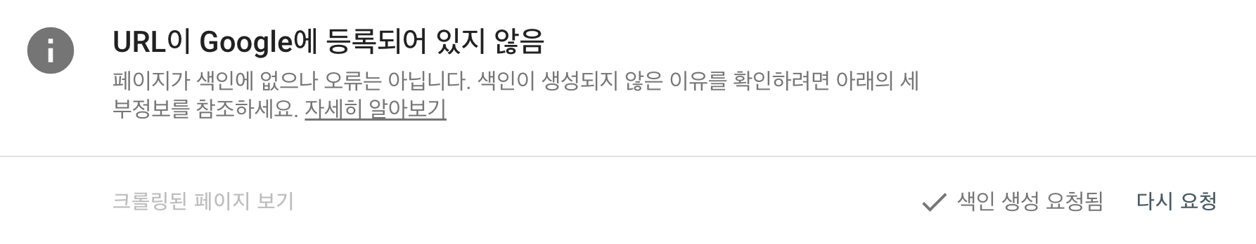 오른쪽 하단에 보시면 '색인 생성 요청' 버튼이 있습니다. 이를 살포시 눌러주면 색인 생성을 요청하게 됩니다.