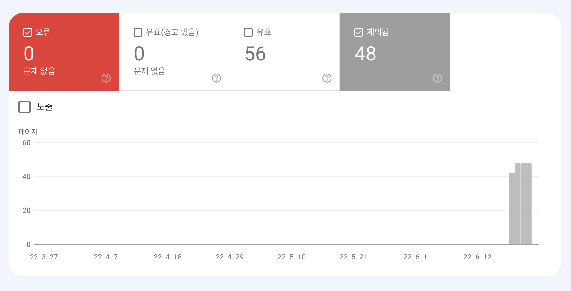 로그인 후, 왼쪽 사이드바에서 '색인 생성 범위'를 클릭하면 위와 같은 화면이 나옵니다. 오류라고 쓰여 있는 빨간 상자 오른쪽 끝에 '제외됨'이라고 표시된 글들을 등록해보도록 하겠습니다. 먼저 회색 박스인 '제외됨'을 눌러봅니다.