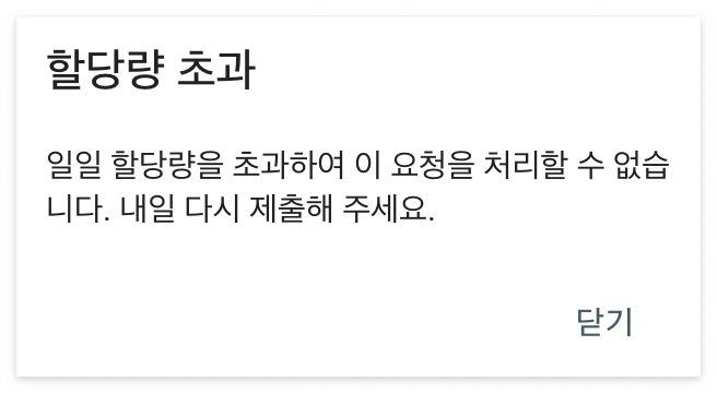 주의점: 하루에 색인 생성을 요청할 수 있는 횟수가 제한되어 있습니다. 제가 해보니 하루에 약 10개~15개 정도 가능한 것 같아요. 열심히 쓴 글에 색인이 붙어있지 않다면 꾸준히 접속해서 색인 생성을 요청해 보세요. 하루 할당량을 초과하면 아래와 같은 메시지가 출몰하니 꾸준히 매일 몇개씩 하면 좋을 것 같습니다!