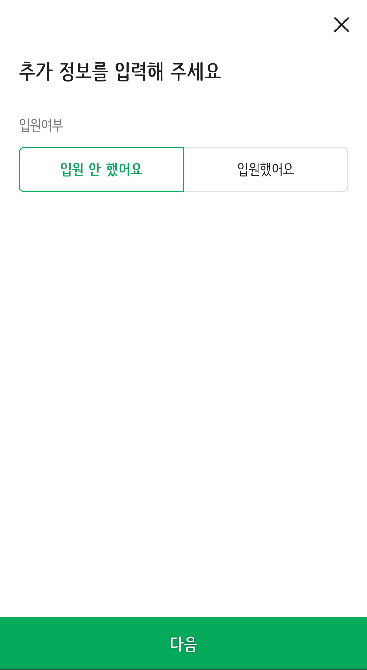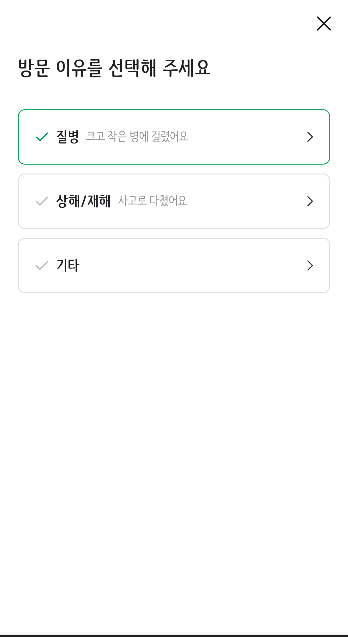 사고가 나서 다치신 경우라면 상해/재해 를 체크하시면 되고, 그 외에 그냥 어디가 아파서 외래를 보신 경우라면 질병을 선택해 주시면 됩니다. 방문 이유 선택 후에는 입원 여부를 선택해 주고 다음으로 넘어갑니다.