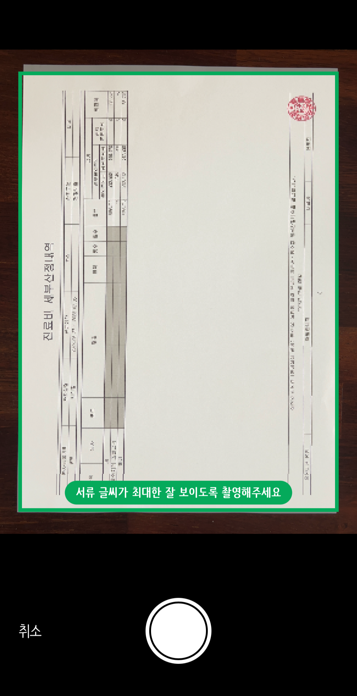 사진을 찍으실 때에는 최대한 글씨가 잘 보이게 찍어주셔야 하는데요. 어두운 바탕에 서류를 놓아두시고 가급적 초록색 네모칸 안에 잘 들어가게 사진을 찍어주시면 문제없이 접수가 됩니다.