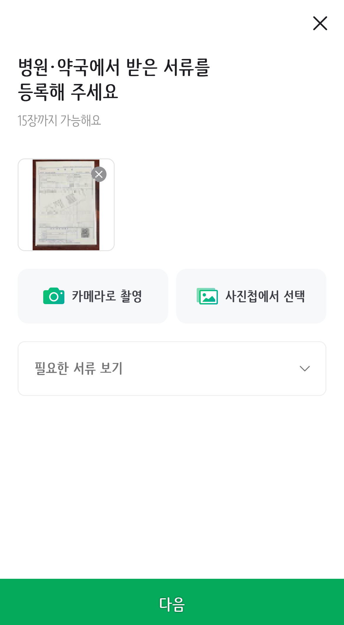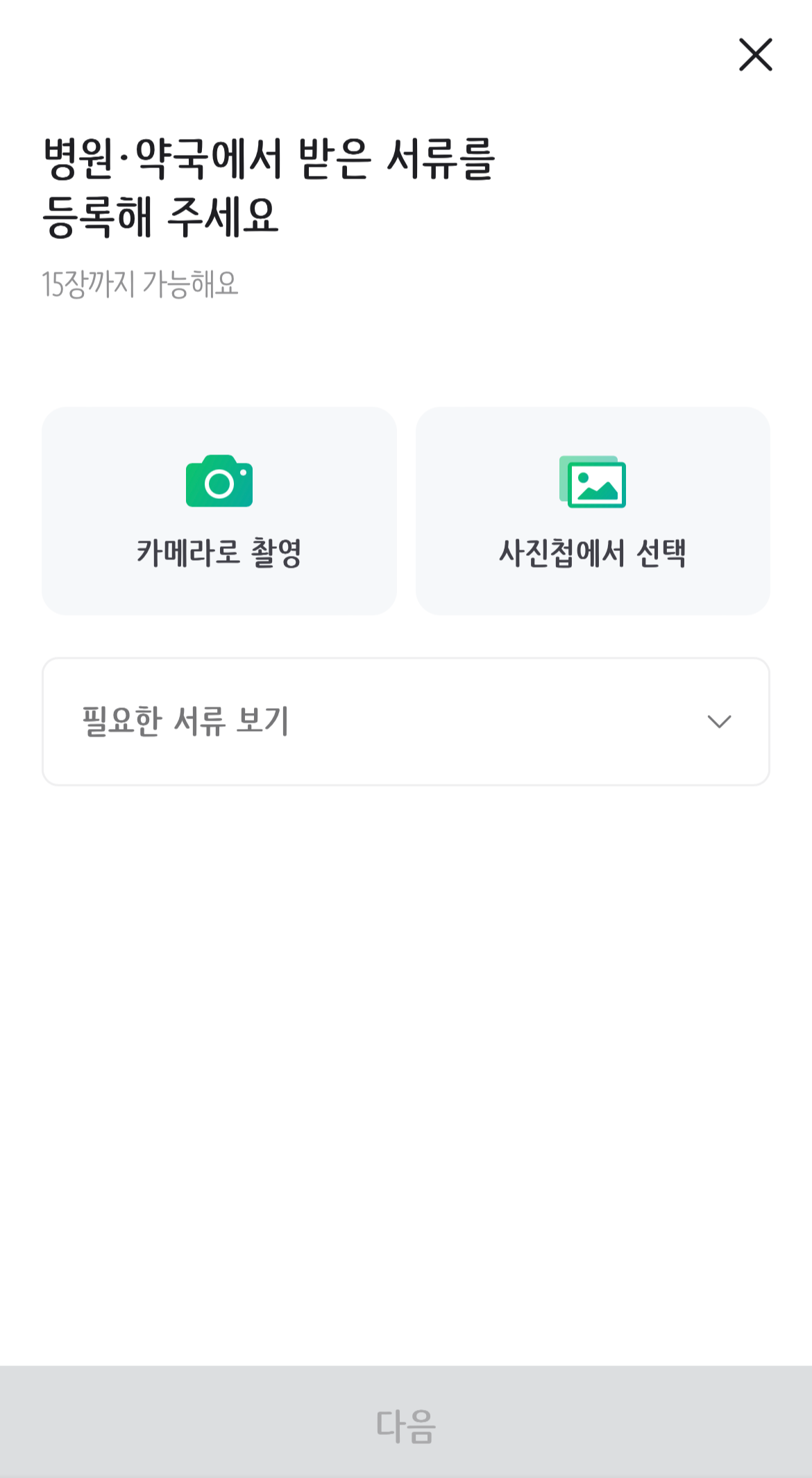 기본적인 정보는 모두 앞에서 입력하였기 때문에 이제는 정말 중요한 서류를 등록해 줍니다. 서류 등록방법도 특별히 어렵지 않습니다. 병원이나 약국에서 받은 서류를 차근차근 등록해 주면 되는데요. 휴대폰 사진으로 찍어 등록해주면 됩니다.