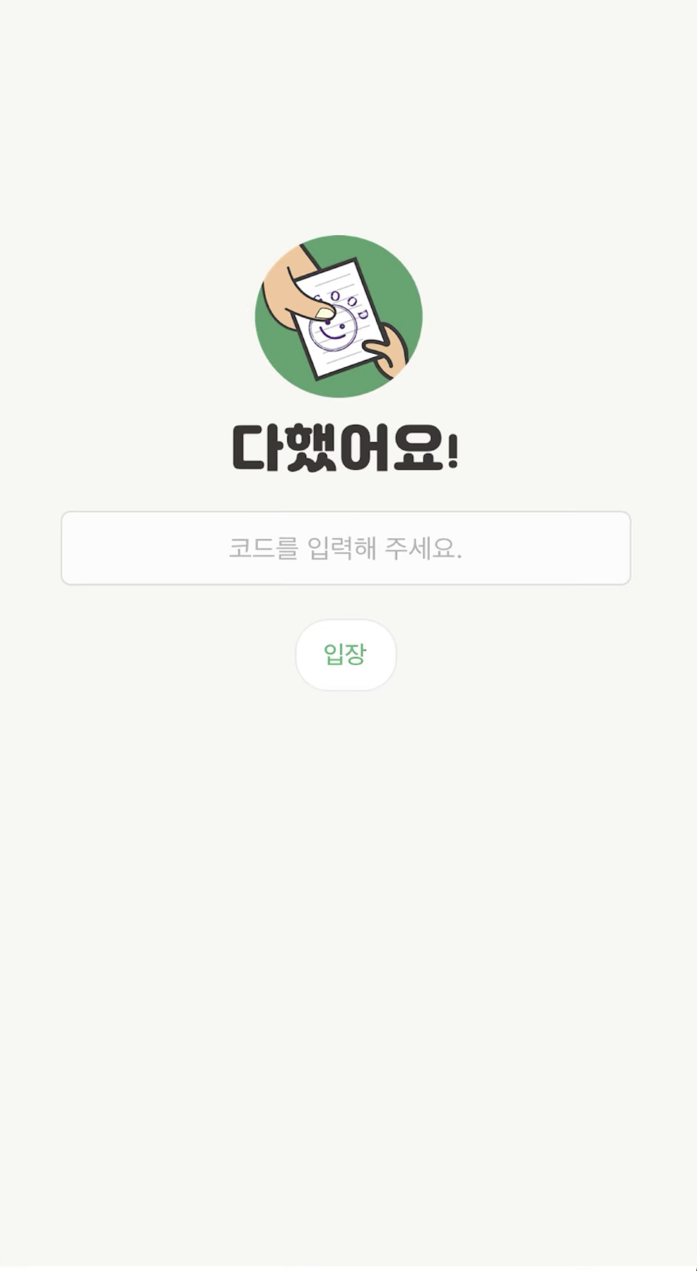 학생용은 앱스토어 등등에서 [다했어요]를 검색하면 위와 같은 어플이 나옵니다. 학생들은 어플을 다운받은 후, 교사가 보내주는 입장코드를 이용하여 입장할 수 있습니다. 회원가입은 필요하지 않더라구요.
