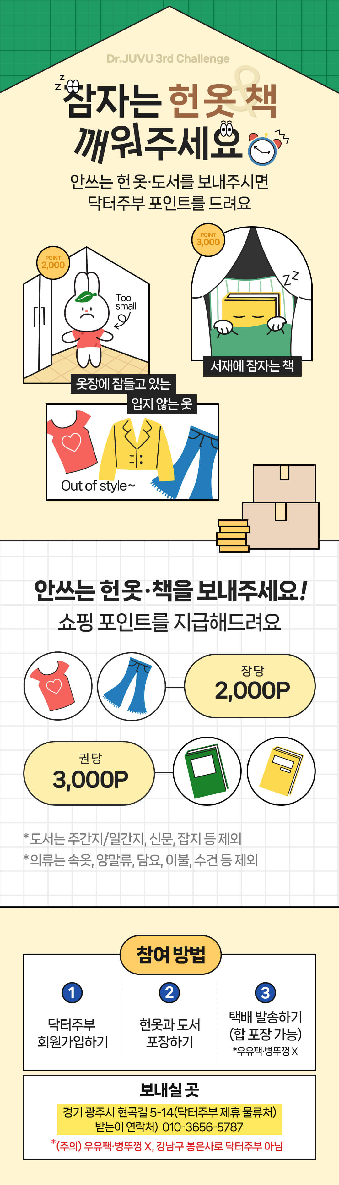 우유팩을 보내고 어플에 들어가 보니 닥터 주부에서 헌 옷과 책을 수거하는 이벤트도 진행하고 있습니다. 아이들 책이 워낙 많은지라 줄이고 줄여도 더 이상 당근에도 알라딘에도 팔리지 않던 책이 참 많았는데, 이번 기회에 닥터 주부에 한번 보내보려고 합니다. 아이들 옷도 철이 지나고 물려줄 곳도 물려줄 상태도 아닌 옷이 참 많았는데, 깨끗한 옷 위주로 골라서 한번 보내봐야겠어요. 헌 옷은 장당 2,000포인트, 책은 권당 3,000포 인트라고 하니 꽤 쏠쏠하죠?