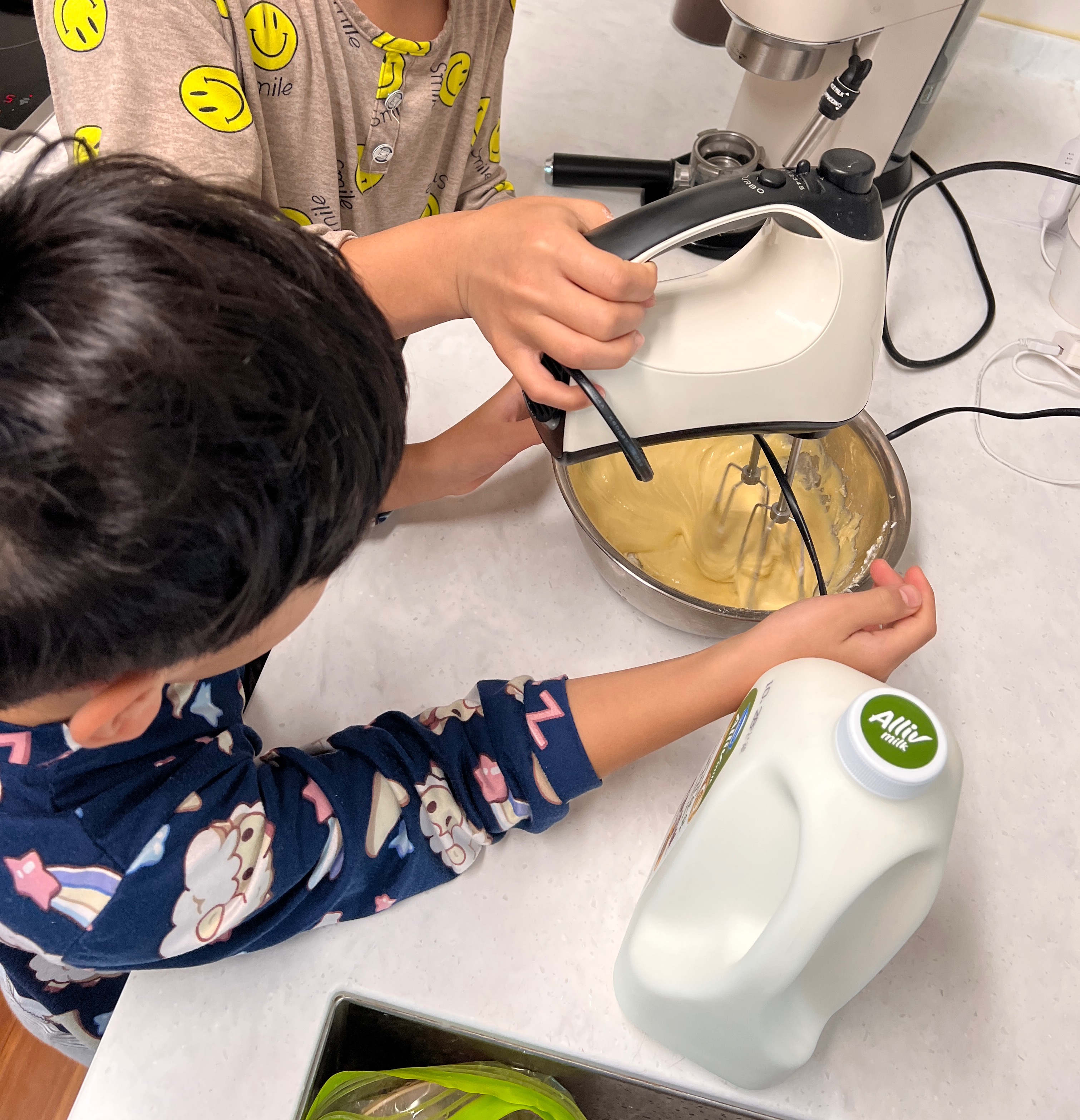 핫케이크 가루에 우유와 계란을 적당량 넣어주고 고르게 섞어줍니다. 예전에는 이런 것을 시키면 잘 하지 못하여 가루가 온 주방에 사방팔방 튀게 만들어놓아서 시키기 꺼려졌었는데, 이제 다 커서 그런지 제법 잘 섞습니다.