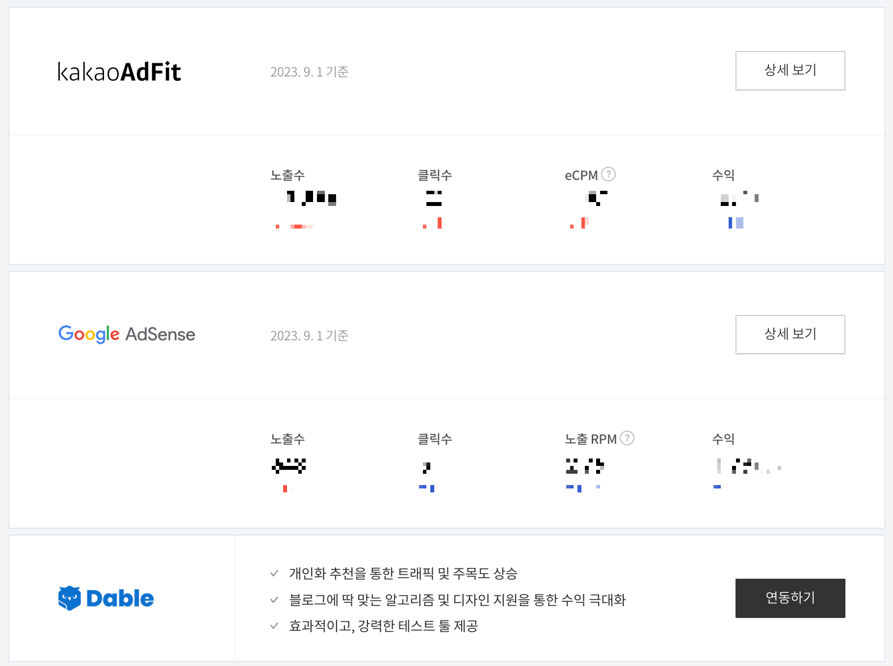 에드핏처럼 수익이 거의 나지 않아 버리다시피 한 광고도 이런저런 궁리를 하다보니 수익이 점차 높아지듯이 데이블도 제게 수익을 얼마나 가져다줄 수 있을지를 좀더 고민해봐야겠습니다.