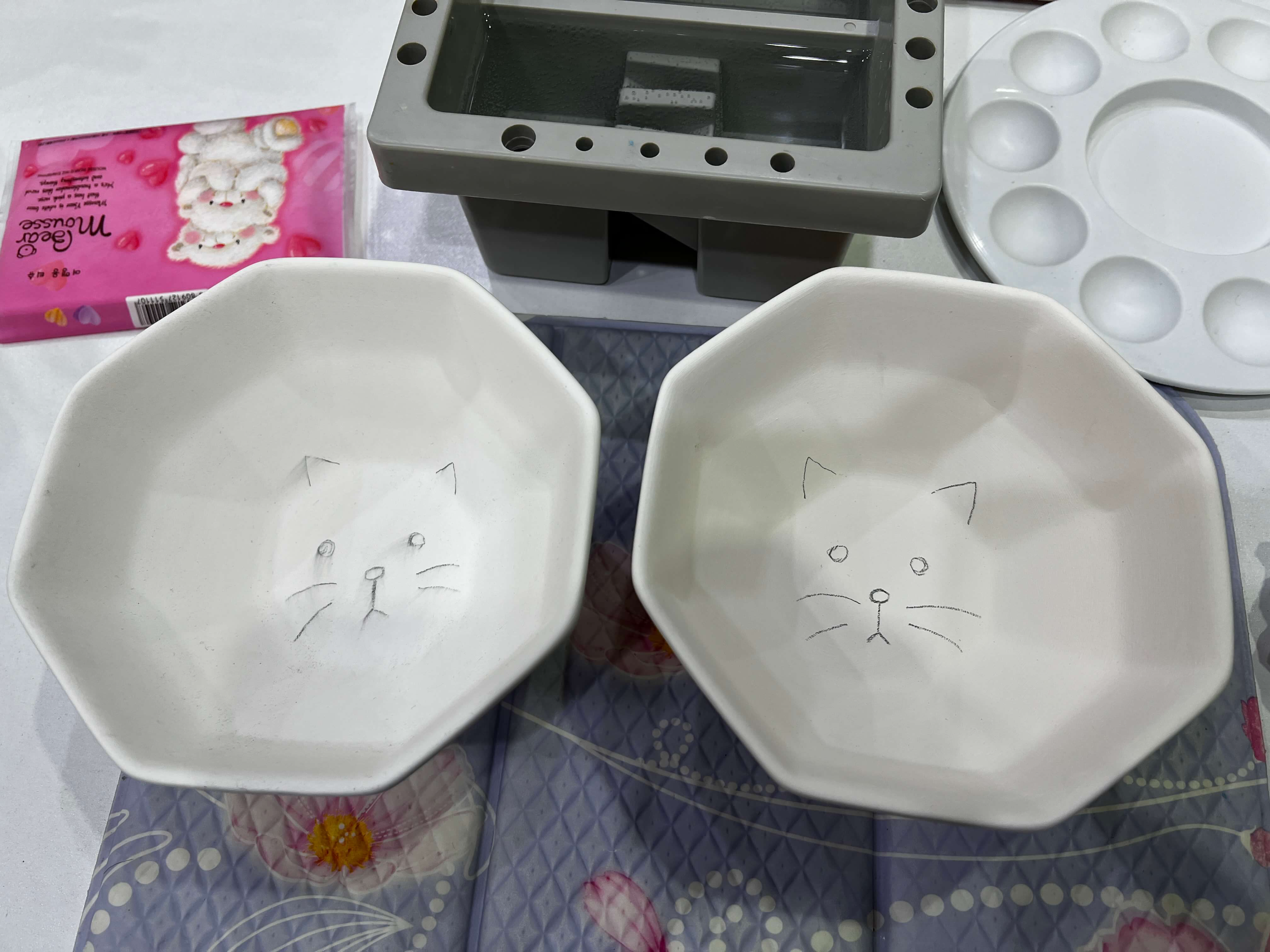 제가 선택한 그릇은 육각형 모양의 국그릇이었습니다. 국그릇과 밥그릇이 세트인 제품인데, 저는 그냥 국그릇으로만 2개를 집어들었습니다. 아이들이 점점 커지니까 시리얼이라든가 라면이라든가 넣어 먹기에 괜찮은 사이즈의 그릇이 필요했거든요. 하얗게 예쁜 그릇을 보니 대체 뭘 그려야 할지 고민이 되었던 찰나, 옆에 계신 선생님이 금손으로 고양이를 그려 넣어주어 고양이그릇을 만들어보기로 합니다.