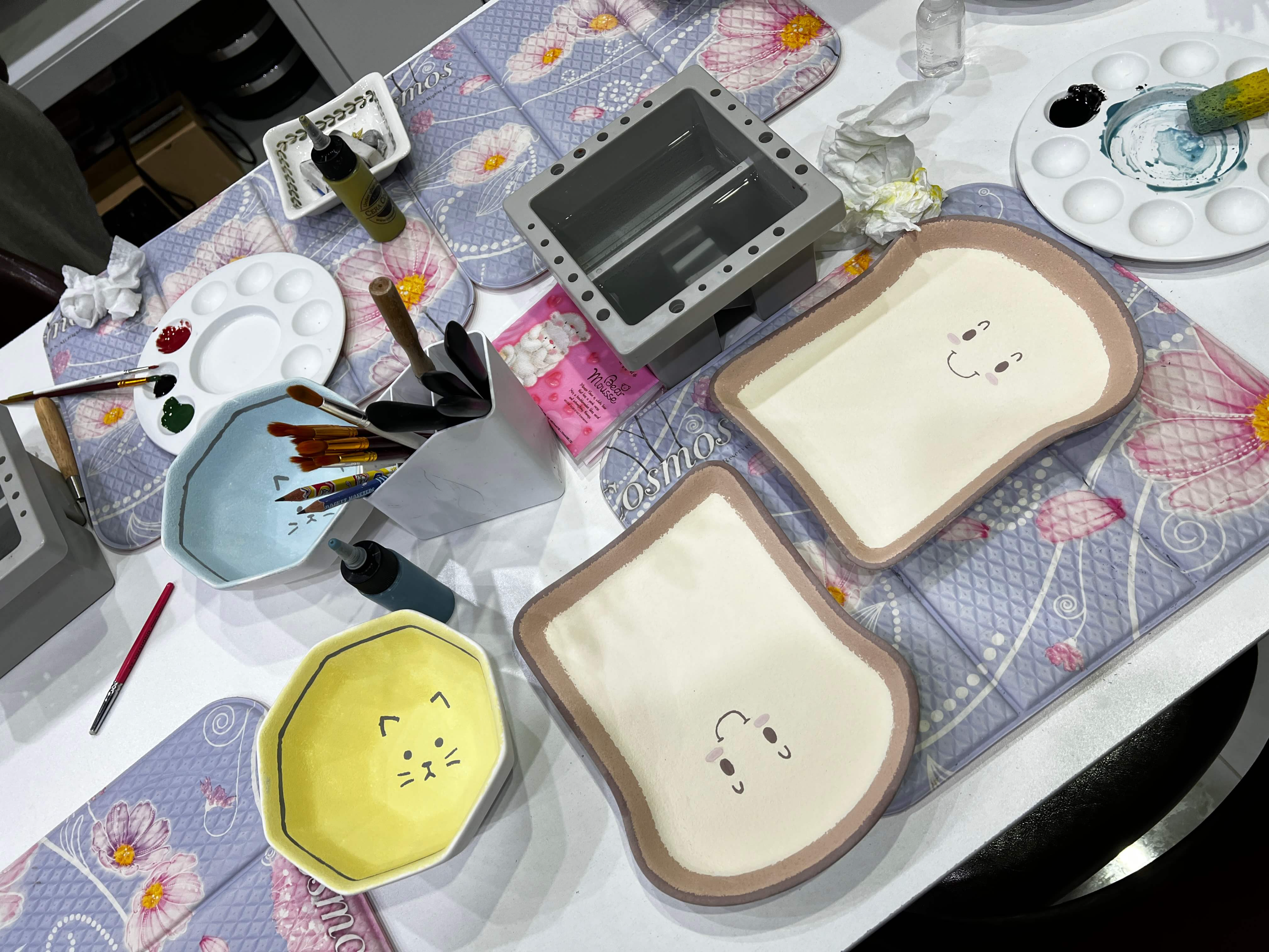 다른 선생님들이 만드신 작품을 보니 제 작품(?)은 한없이 초라해지기만 합니다. 옆 선생님은 식빵접시를 선택하셨는데 얼굴도 귀엽게 그려넣으셔서 아침에 꺼내 쓸 맛이 날 것 같아요. 바삐 다음 장소로 이동해야 해서 다른 선생님들의 작품을 다 찍지는 못했지만, 체육선생님의 크리스마스 접시도 너무 예뻤고 짱구가 그려진 카레용 접시도 참 예뻤습니다. 저 빼고 선생님들의 솜씨가 다 좋은 것으로...ㅠㅠ