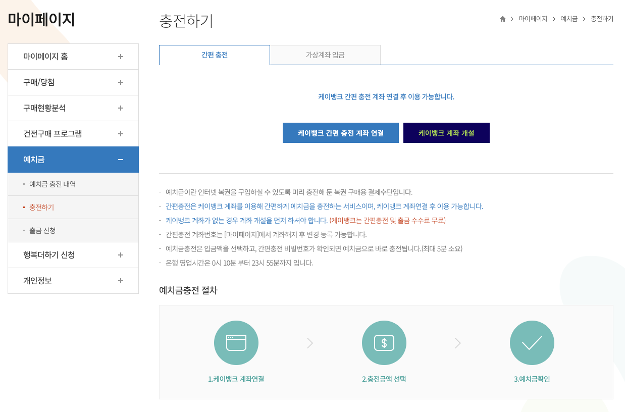 회원가입 후, 로그인을 하시면 마이페이지에서 충전을 하실 수 있습니다. 로또 구입 예치금은 케이뱅크를 가지고 계시면 편리하게 계좌를 연결하여 충전하실 수 있습니다. 케이뱅크를 이용하시면 간편충전과 출금수수료가 무료이니 케이뱅크가 있으신 분들이라면 케이뱅크 계좌를 연결하시면 됩니다.