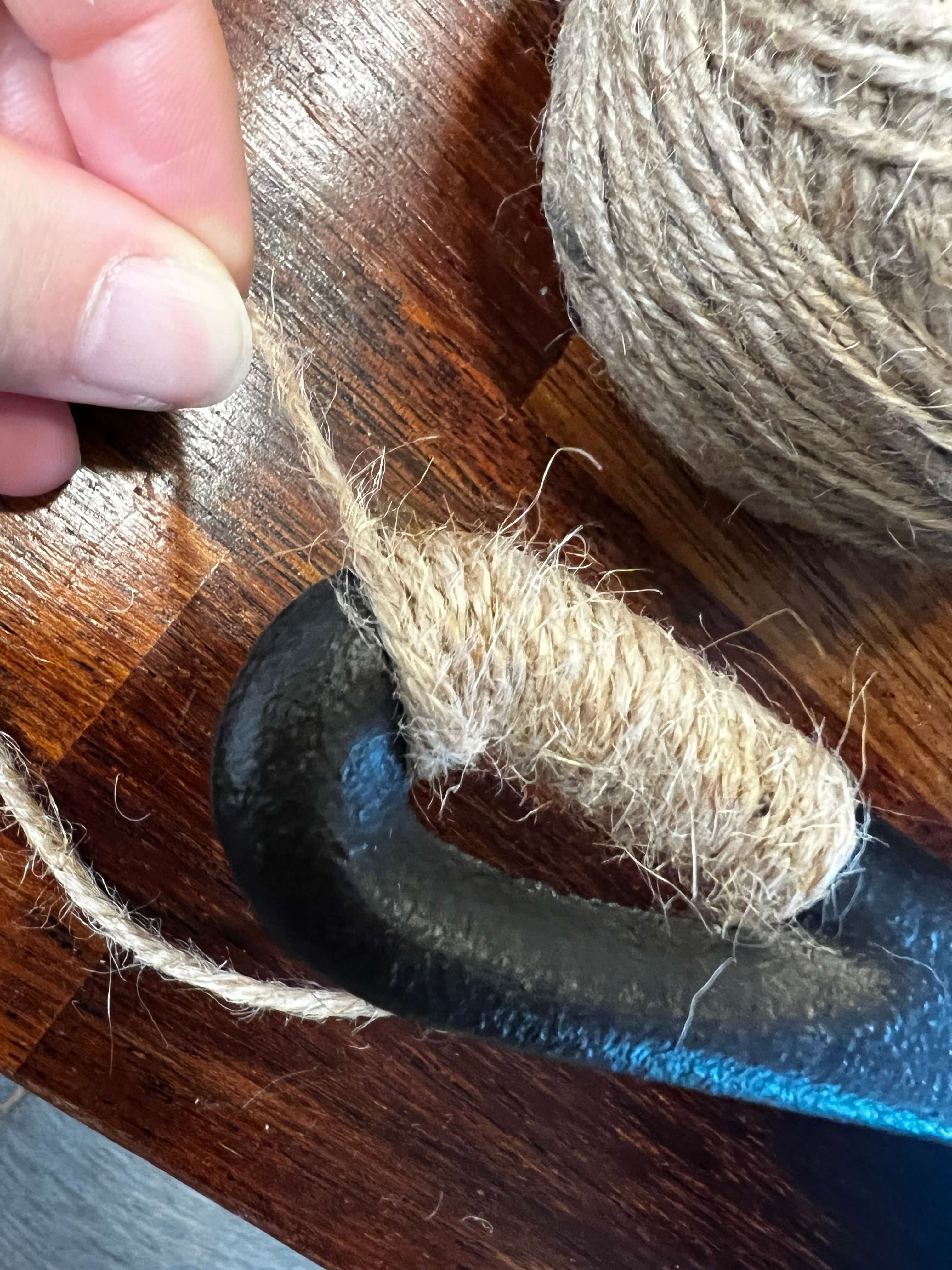 특별한 방법은 없고 그냥 제 생각대로 감아주었어요. 손잡이 끝 부분이 동그래서 그 부분이 감기 좀 어려웠는데 적당히 틈이 생기게 방사형으로 감아보았습니다. 일단 마끈을 길게 죽 빼주고 손잡이의 구멍이 뚫린 부분부터 위쪽으로 감아봅니다.