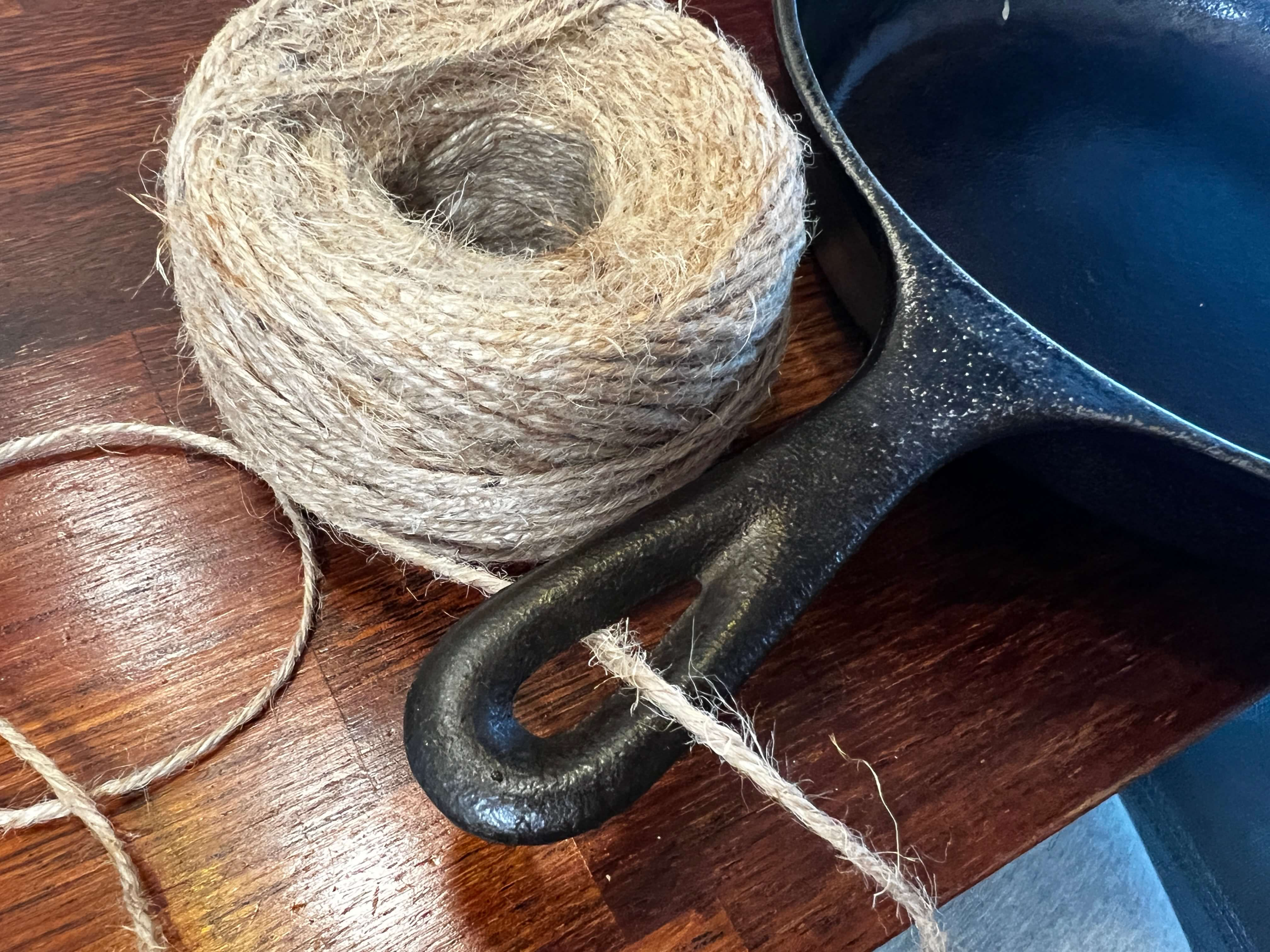 롯지(Lodge) 무쇠팬을 하나 사용하고 있습니다. 무쇠팬의 특성상 시즈닝도 해줘야 하고 박박 사포로 때도 벗겨주어야 하기에 관리가 좀 번거롭다고 생각할 수 있지만, 의외로 길을 잘 들여놓으면 세척도 간편하고 보관도 용이해서 자주 사용하는 애정하는 주방아이템이죠. 오늘은 로지 손잡이에 마끈으로 손잡이를 만들어주었습니다.