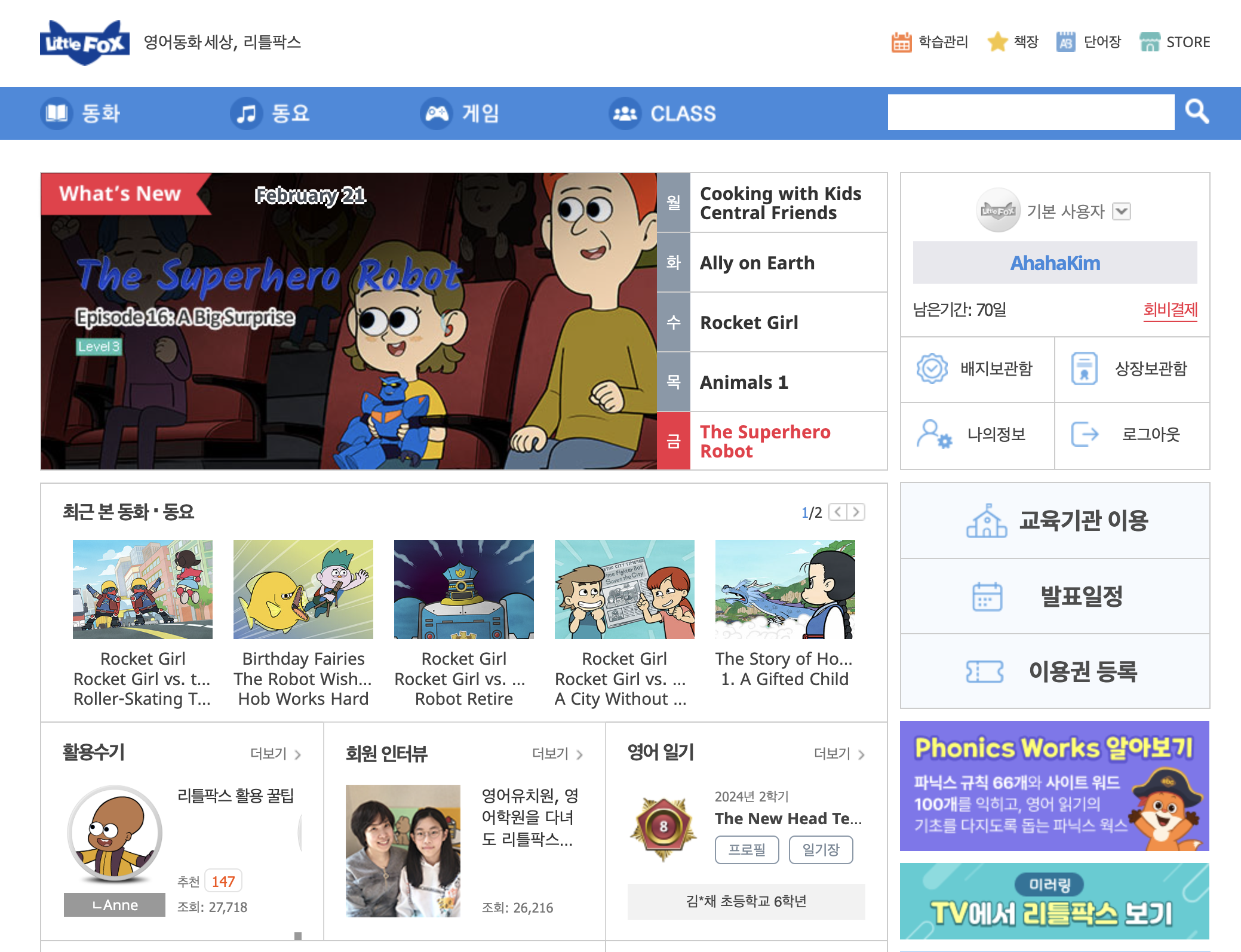 교사할인을 받아 학교에서 이용할 수 있게 되면서 학교 수업 중에도 리틀팍스 동영상을 활용했다. 리틀팍스에 나오는 표현이 교과서에 나오는 경우가 종종 있어서 해당 부분을 영상과 함께 아이들에게 보여주기도 했고, 쉬는시간이나 따로 하는 일이 없는 경우에도 그저 '노출'을 위해 교실에 그냥 틀어두었다. 물론 집에서 엄마가 아이에게 노출해주는 것 만큼 영어에 대한 노출시간이 많지는 않겠지만, 조금이라도 영어에 노출시켜보려는 선생님의 노력을 우리반 아이들은 알런지 모르겠다.