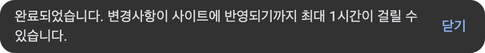설정을 하고 저장을 하면 변경사항이 사이트에 반영되기까지 최대 1시간이 걸린다는 메시지가 나오면서 설정이 완료됩니다. 이로써 마치 '블로그 게시글 더 보기'와 같은 기능을 갖춘 광고를 노출할 수 있게 되었네요.