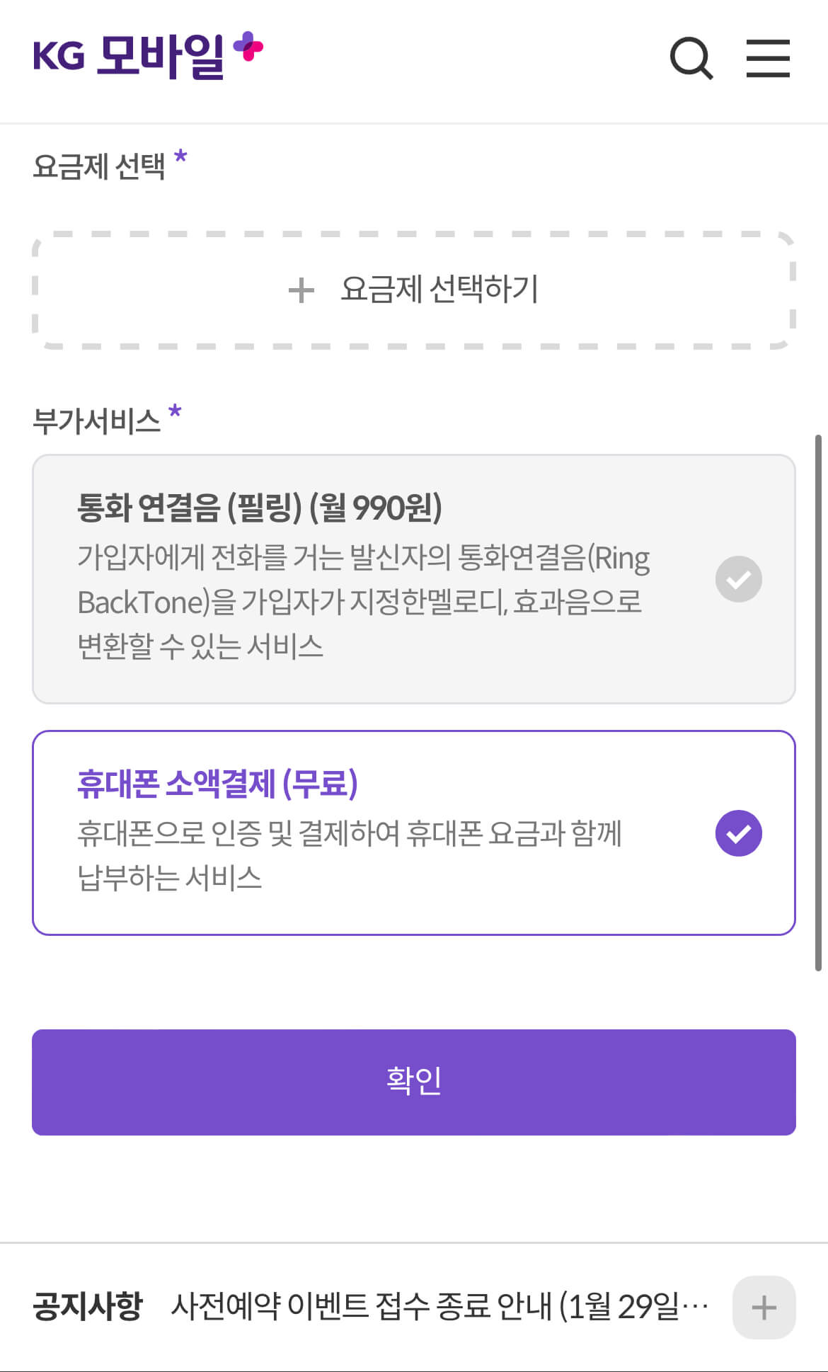 KG 모바일+에 들어간 후, 셀프개통을 눌러줍니다. 원하는 요금제를 선택한 후, 필요한 부가서비스가 있으시다면 선택하고 확인을 누르시면 됩니다 저는 굳이 통화 연결음 부가서비스는 필요하지 않아 체크 해제하고 확인을 눌렀습니다.