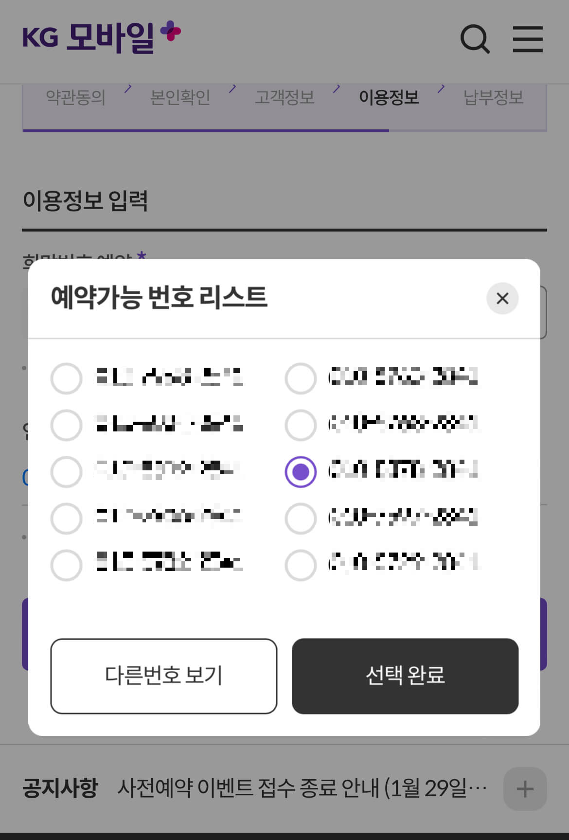 사전정보입력이 끝나면 신청서를 작성합니다. 약관동의를 해 주신 후, 예약가능 번호리스트에서 원하는 번호를 골라줍니다. 뒷자리를 지정하시면 가능한 전화번호가 10개 제시됩니다. 저는 마음에 드는 번호가 없어서 아래 [다른 번호 보기]를 눌러보았는데 다른 번호가 나오지는 않더라고요. 그냥 있는 번호 중에 골라서 [선택완료]를 눌렀고, 휴대폰이 한번 꺼졌다가 켜지면서 개통이 완료되었습니다.
