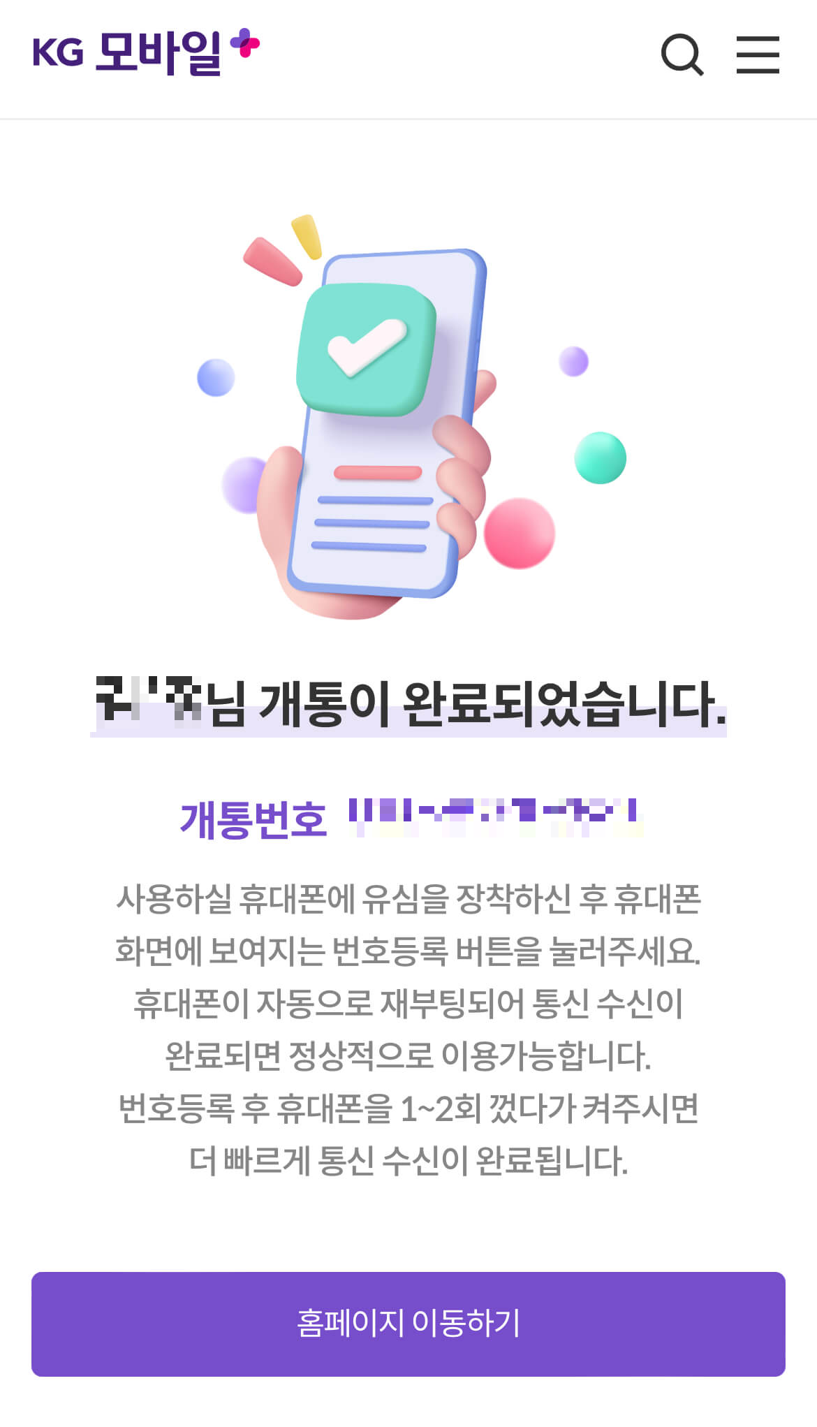 사전정보입력이 끝나면 신청서를 작성합니다. 약관동의를 해 주신 후, 예약가능 번호리스트에서 원하는 번호를 골라줍니다. 뒷자리를 지정하시면 가능한 전화번호가 10개 제시됩니다. 저는 마음에 드는 번호가 없어서 아래 [다른 번호 보기]를 눌러보았는데 다른 번호가 나오지는 않더라고요. 그냥 있는 번호 중에 골라서 [선택완료]를 눌렀고, 휴대폰이 한번 꺼졌다가 켜지면서 개통이 완료되었습니다.
