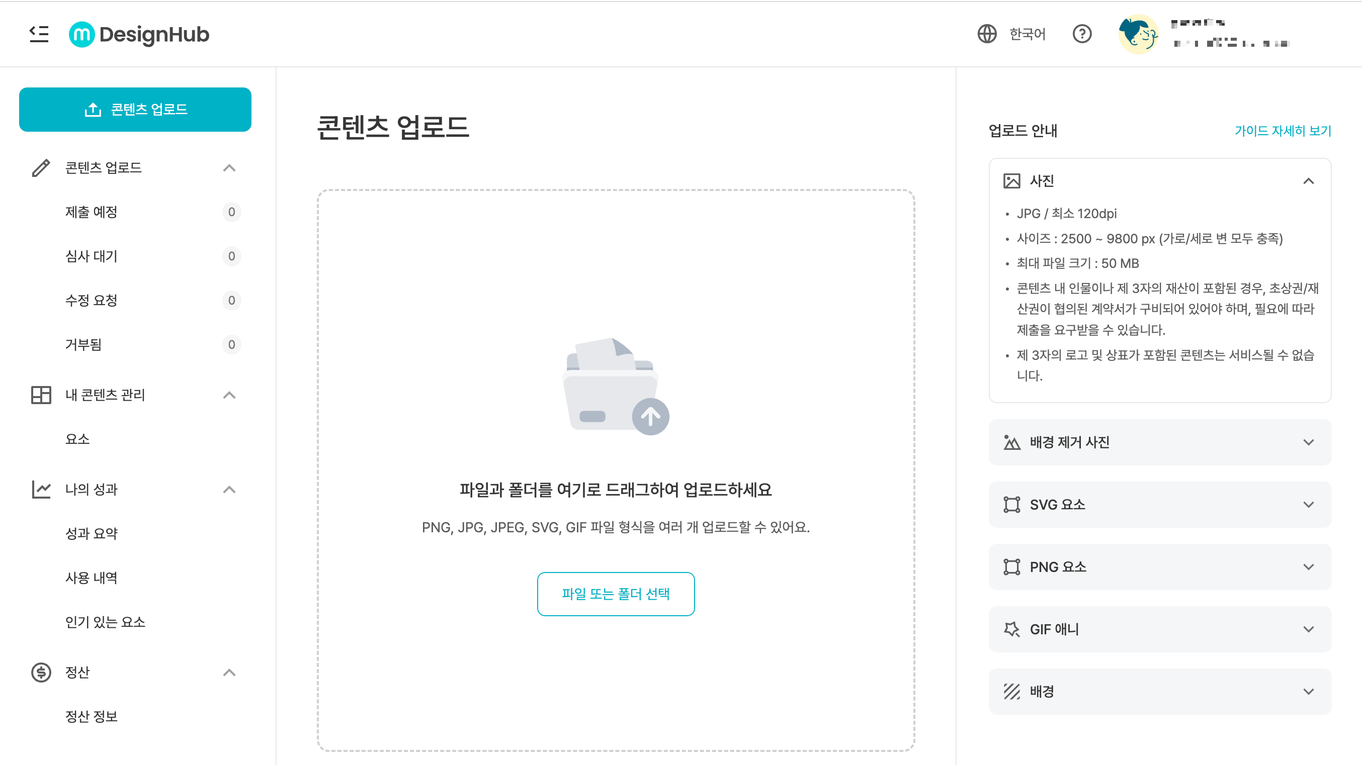 미리캔버스에서 콘텐츠를 등록하는 방법은 어렵지 않습니다. 디자인허브에 들어가서 왼쪽의 [콘텐츠 업로드]를 클릭합니다. 컴퓨터에 파일이나 폴더를 가지고 있다면 그대로 드래그하여 사진을 업로드하면 됩니다.