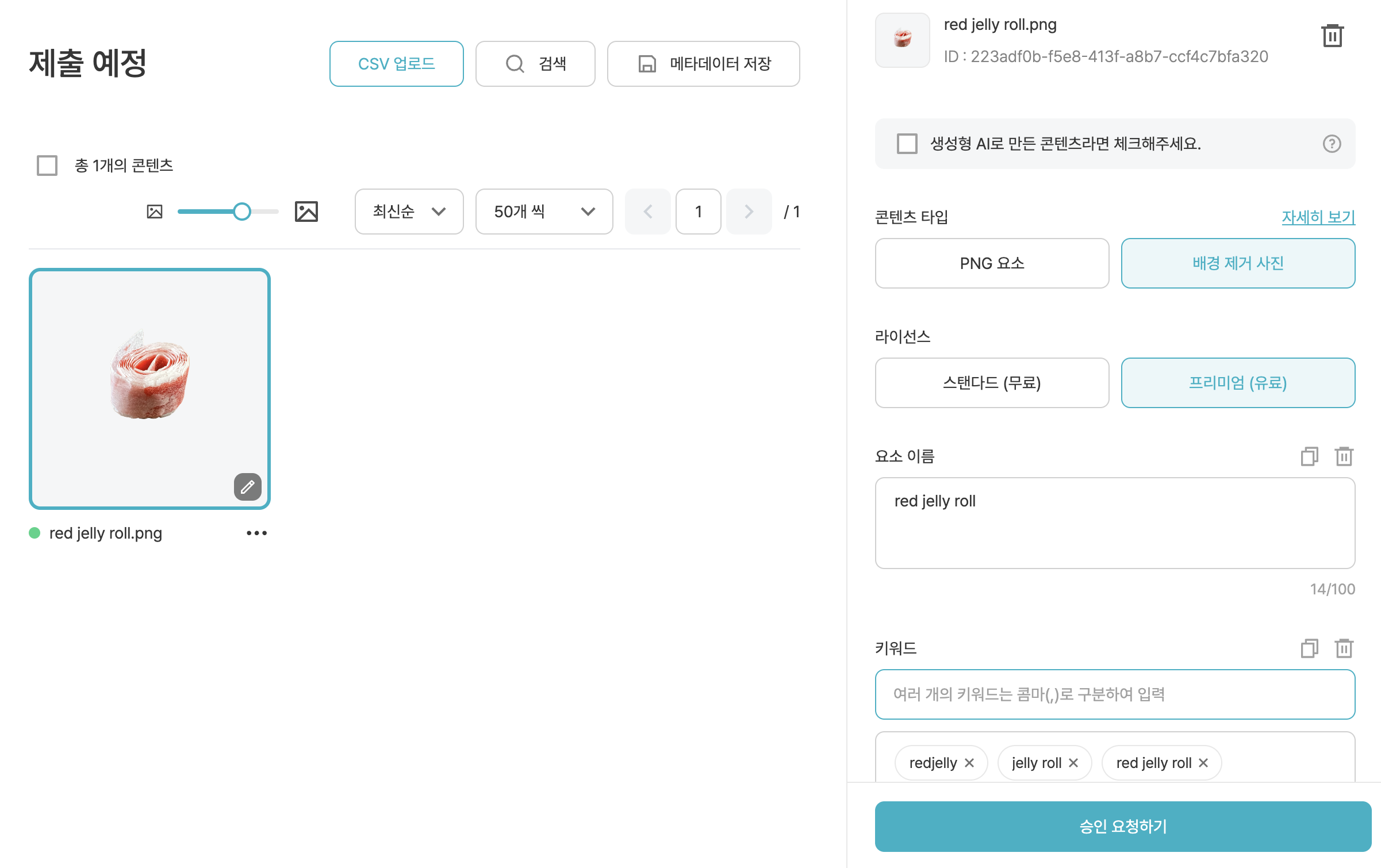 미리캔버스에 업로드하기 위해 만들어둔 사진을 업로드해보았습니다. 콘텐츠 업로드에 원하는 파일을 추가합니다. 아직은 제출이 된 상태는 아니고 제출 예정이기 때문에 오른쪽에서 파일명이나 콘텐츠 타입, 라이선스, 요소 이름과 키워드까지 작성해줍니다. 별 생각없이 영어로 작성했는데 미리캔버스는 국내용 툴이기 때문에 한글로 작성하시는 것이 더 나을 것 같기는 합니다.