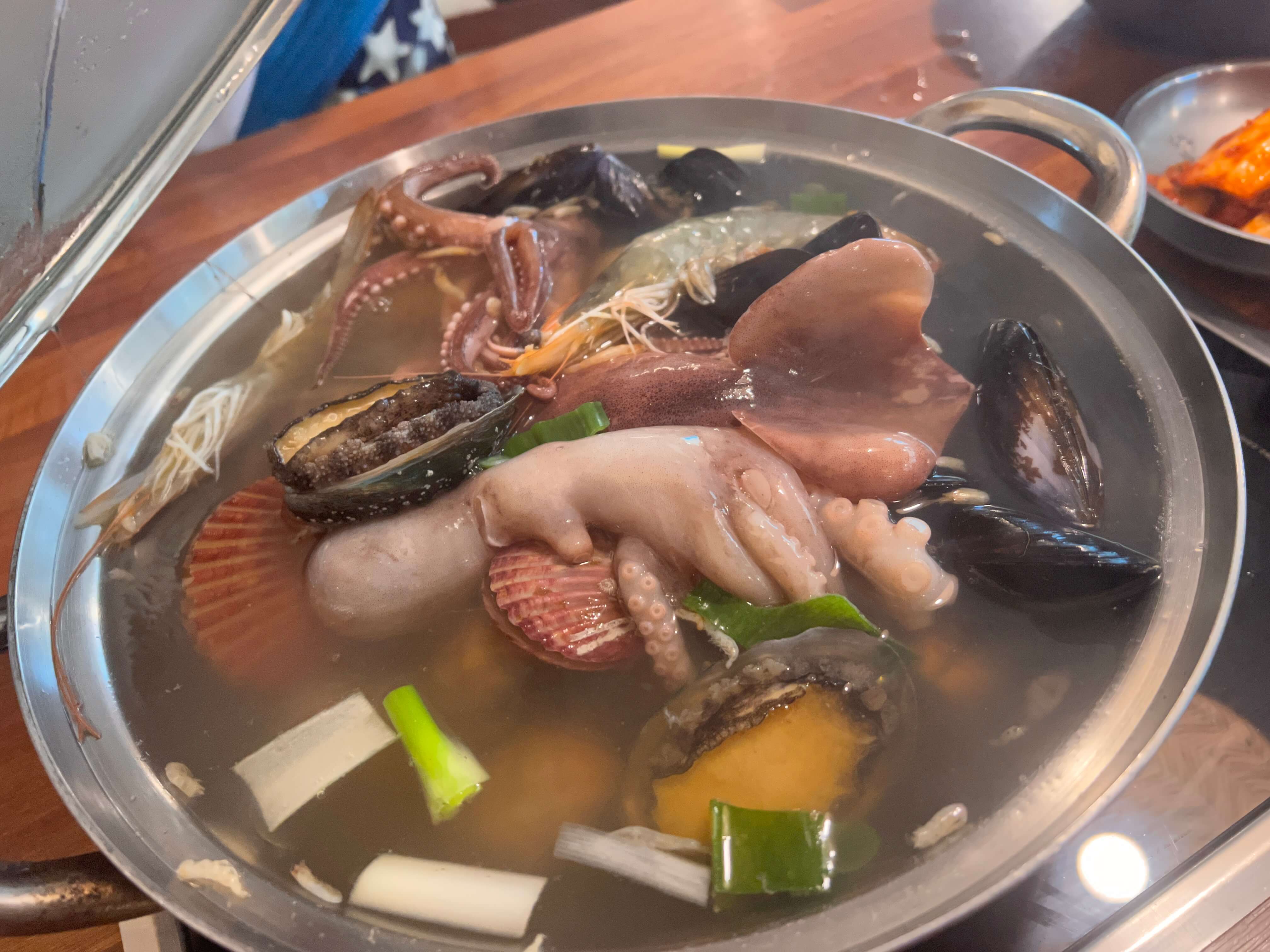해물이 푸짐하게 들어있고, 전복도 제법 큰 것이 2개나 들어있네요. 싱싱한 해물을 팔팔 끓여 먼저 건져먹고 다 먹은 국물에 손칼국수를 넣어 끓여먹습니다. 칼국수나 해물을 별로 좋아하지 않지만 이날은 날씨와 맛의 콜라보 덕분에 정말 맛있게 먹었어요.