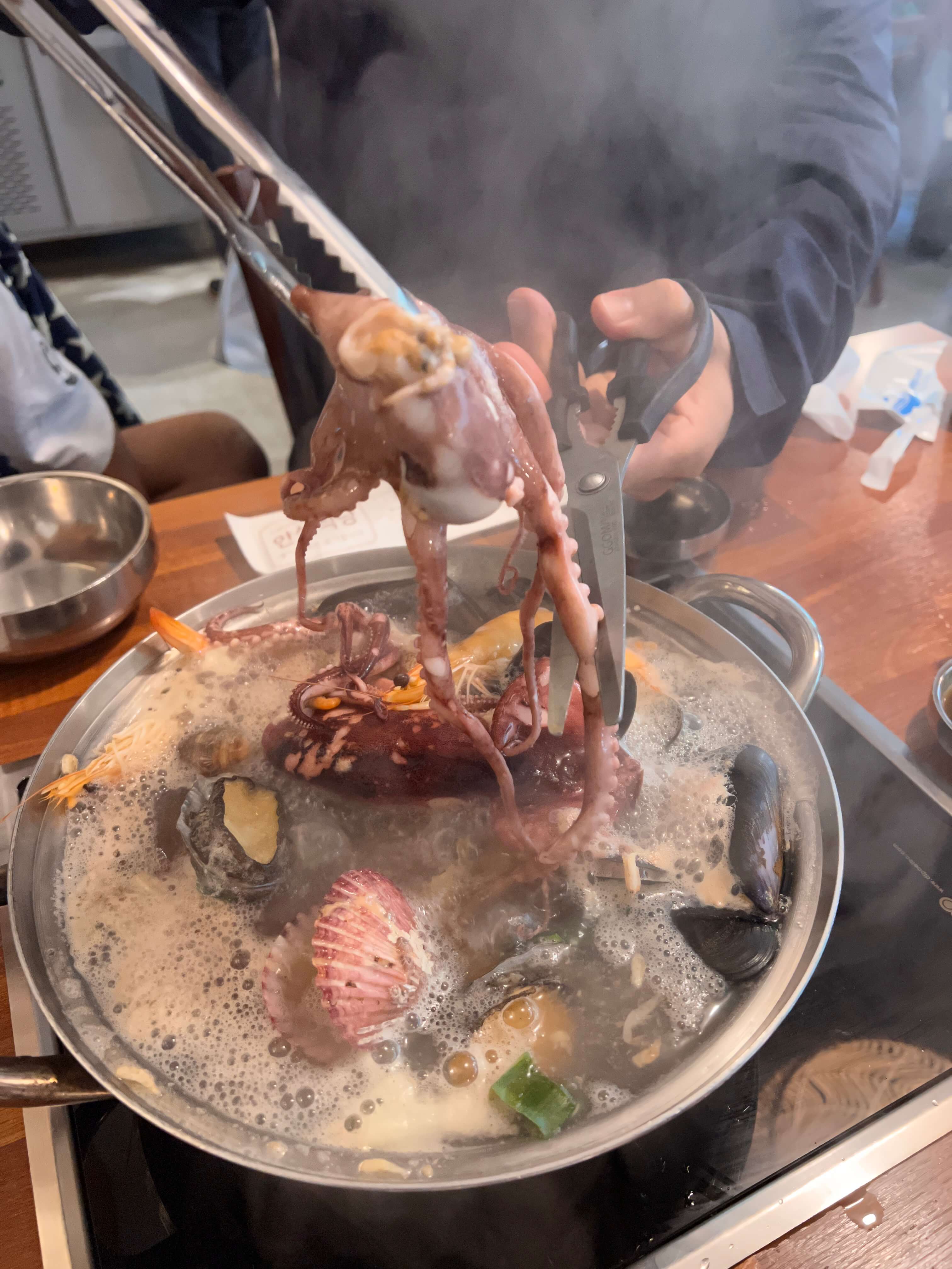 해물이 푸짐하게 들어있고, 전복도 제법 큰 것이 2개나 들어있네요. 싱싱한 해물을 팔팔 끓여 먼저 건져먹고 다 먹은 국물에 손칼국수를 넣어 끓여먹습니다. 칼국수나 해물을 별로 좋아하지 않지만 이날은 날씨와 맛의 콜라보 덕분에 정말 맛있게 먹었어요.