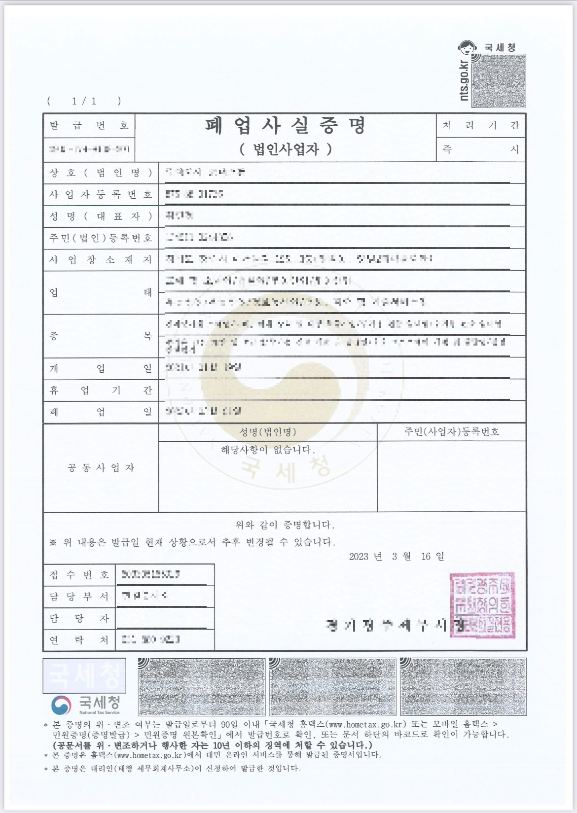 법인은 뭘 하나 하려고 해도 다 돈이 들기 때문에 사소한 변경등기조차 쉽게 하지 못하는 경우가 많은데요. 법인사업자를 청산하기 위해서는 비용적인 면도 있기 때문에 일단 사업자 폐업신청만 해 두었습니다. 홈텍스에서 쉽게 하실 수 있고, 혹은 담당 세무사가 있으신 경우에는 세무사에게 이야기하시면 쉽게 해결됩니다. 폐업 후에는 아래와 같이 폐업사실증명원을 발급받을 수 있습니다.