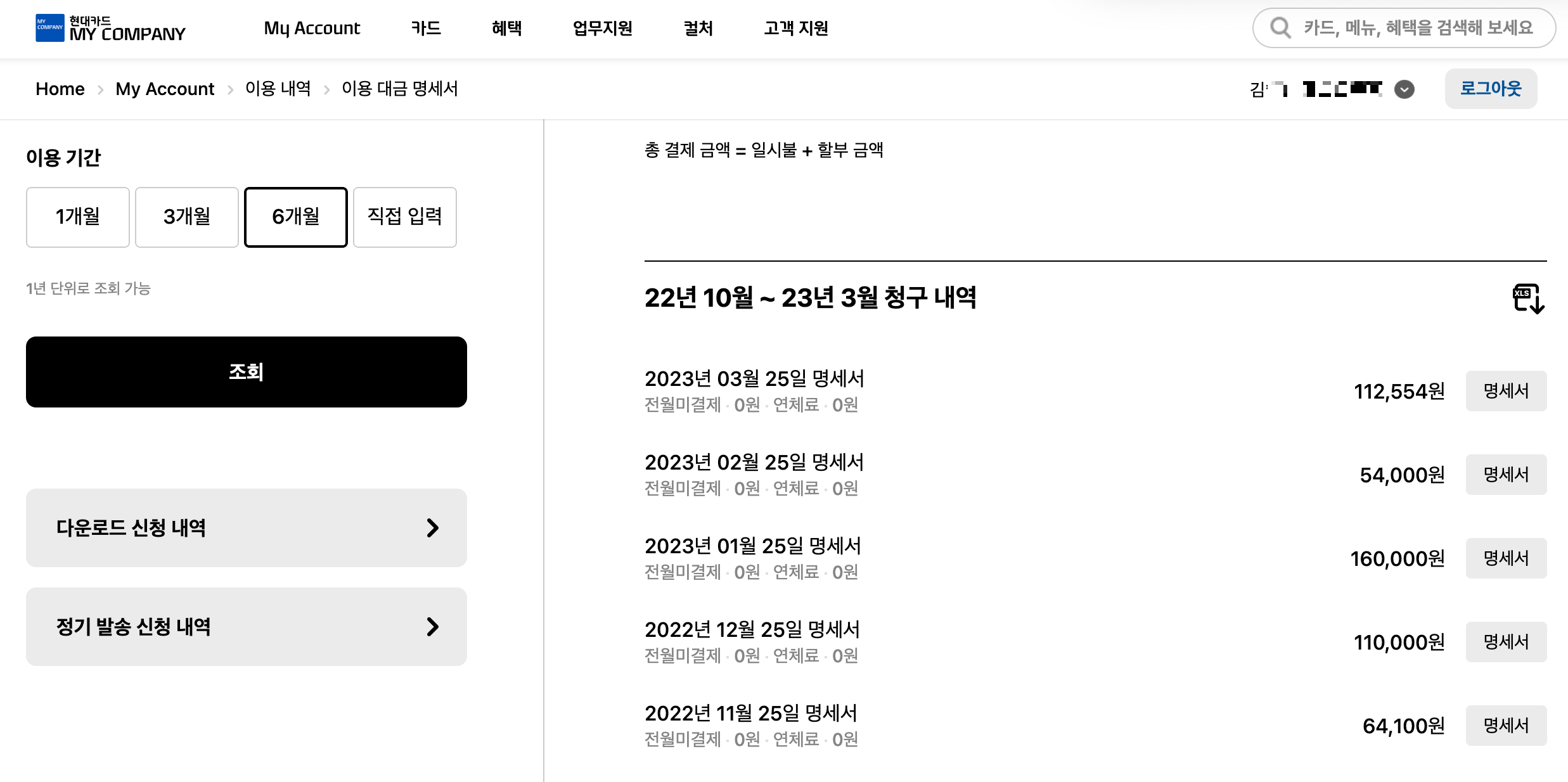 먼저 혹시 모를 올해 분 명세서가 필요할지 몰라 이메일로 6개월치 명세서를 신청해두었습니다. 내년도 법인세를 내야 할 경우 증빙자료로 사용할 수 있나 싶어 다운로드하여 두었는데 필요하지 않을 수도 있습니다. 카드를 해지하게 되면 홈페이지에 접속하지 못할 수도 있으니 미리 준비를 해 두었습니다.