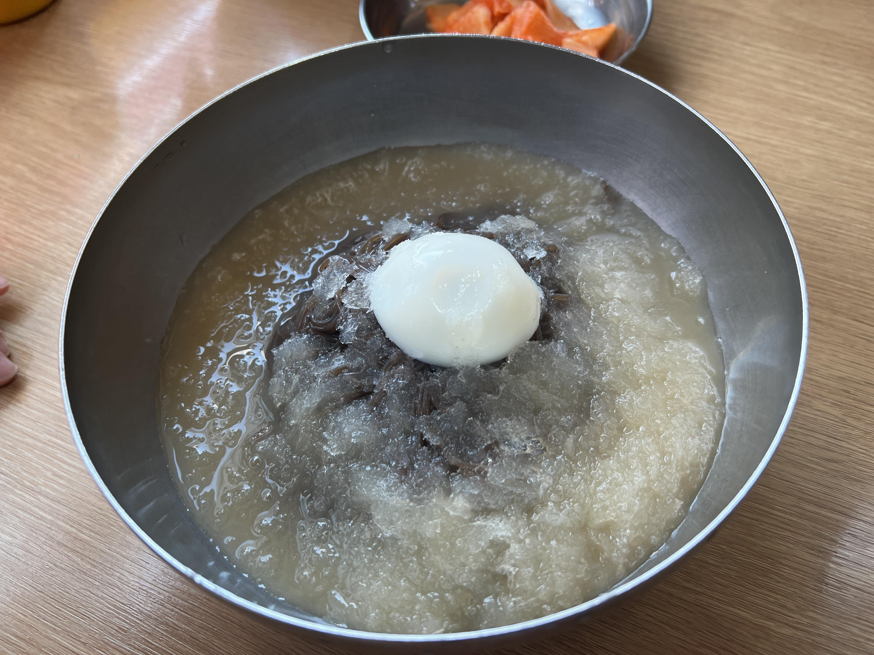 물냉면이나 비빔냉면 모두 칡냉면인데, 두 가지 모두 곱빼기가 가능합니다. 많이 드시고 싶으신 분들은 곱빼기로 주문하시면 됩니다. 이번에 처음 알게 된 것인데 '사리'는 그냥 물냉면의 형태로 나옵니다. 칡냉면에 얼음 육수를 붓고 삶은 계란도 반개가 올라가는데 매운 양념만 빠집니다. 만약 아이가 매운 양념을 잘 먹지 못한다면 사리만 주문하셔도 일반 물냉면처럼 나오니 좋을 것 같습니다. 저희는 물냉 1개, 비냉 2개와 사리 1개를 주문했답니다.
