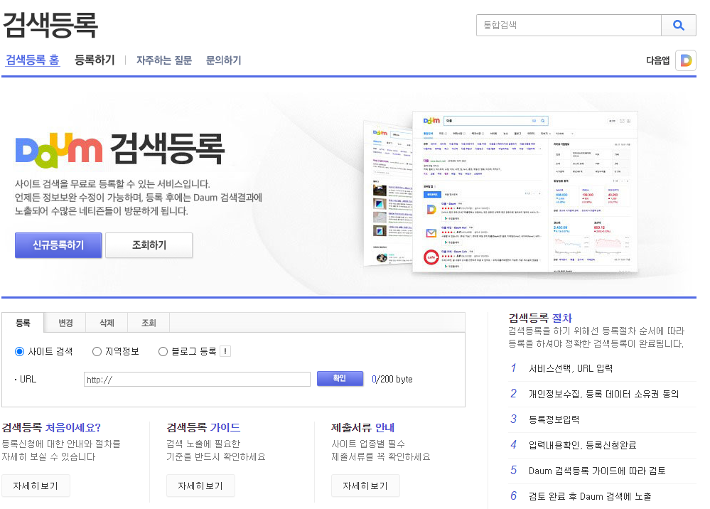 다음 사이트에는 간단히 자신의 블로그 주소를 넣으면 등록이 완료됩니다. 블로그 등록을 선택하시면 블로그 주소와 자신의 이메일을 입력하여 등록이 가능합니다.