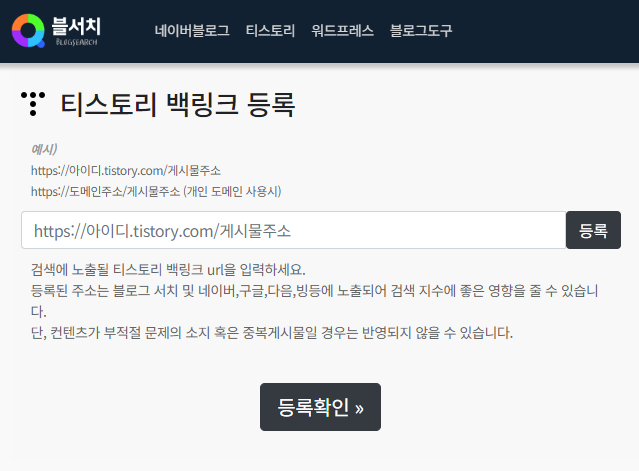 블서치라는 백링크 등록이 가능한 사이트에도 내 블로그를 등록해줍니다. 네이버블로그 또는 티스토리, 워드프레스 모두 등록이 가능하며, 한번 등록해두면 알아서 백링크를 생성해주기 때문에 안할 이유가 없습니다.