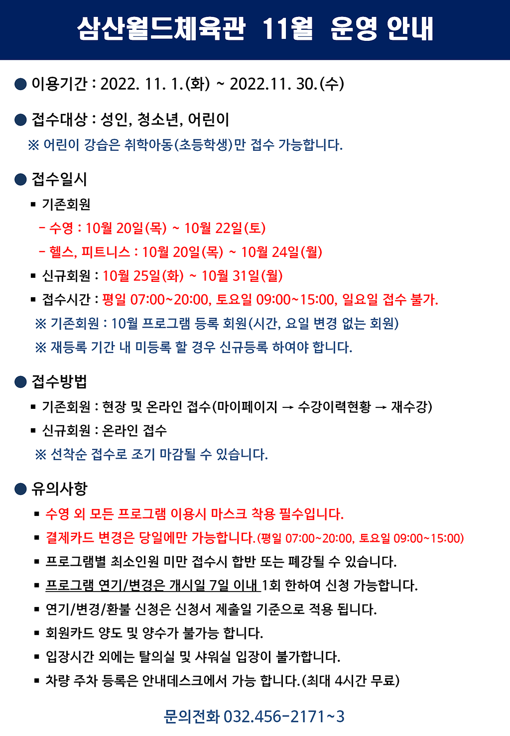 삼산월드체육관 11월 접수가 시작되었습니다!