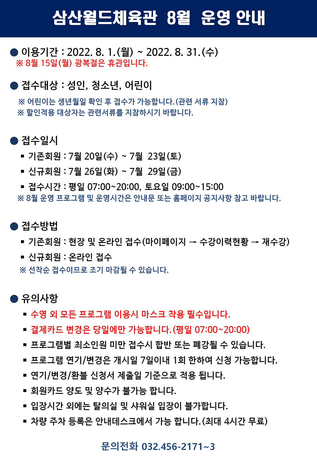 8월 삼산월드체육관 프로그램과 접수요령은 다음과 같습니다. 다양한 프로그램이 개설되어 있으니 어린이수영뿐만 아니라 다른 프로그램도 이용해보시면 좋을 것 같습니다.