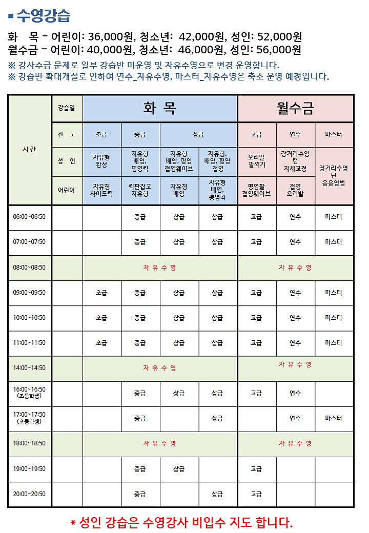 혹시나 아이가 들어가야 할 반이 어떤 반인지 모르겠다면 센터에 전화하셔서 물어보셔도 잘 알려주십니다. 저도 아이가 다른 곳에서 자유형은 했는데 배영은 못해서 어느반에 들어가야 할지 모르겠다고 하니, 어떤 반에 들어가면 된다고 얘기해주시더라구요. 어린이수영은 정말 다른 사설 수영장에 비해 가성비가 좋은 편이라 큰아이는 지금 2년째, 작은아이는 1년째 다니고 있는데요. 물론 4:1로 진행하는 사설수영장에 비하면 인원이 많은 것이 사실이지만(한반에 약 20명), 그럼에도 불구하고 수강료가 너무 저렴하니 큰 장점이 아닌가 싶습니다.