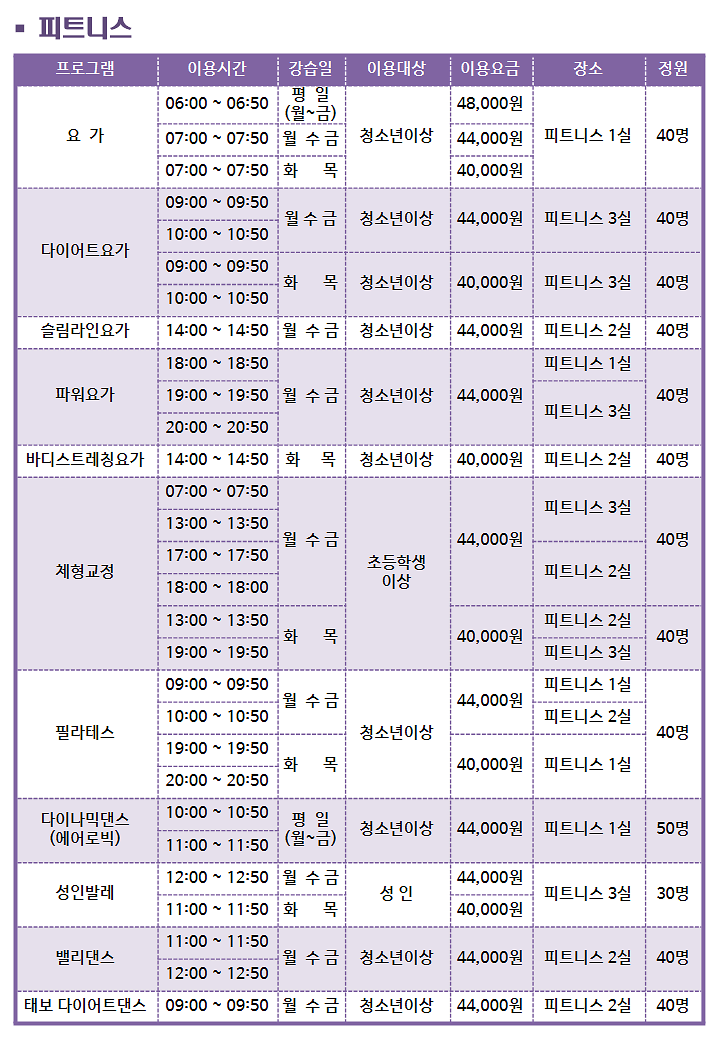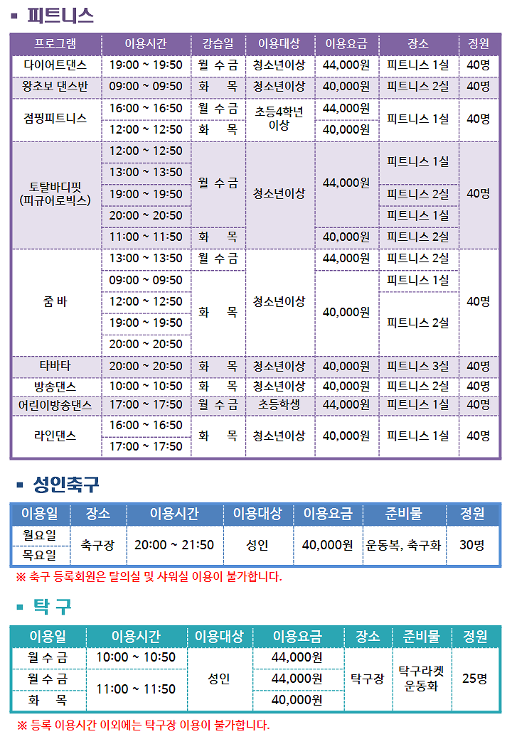 피트니스 외에도 탁구나 축구같은 수업도 개설되어 있으니 관심있으신 분들은 등록에 참고해보시기 바랍니다.