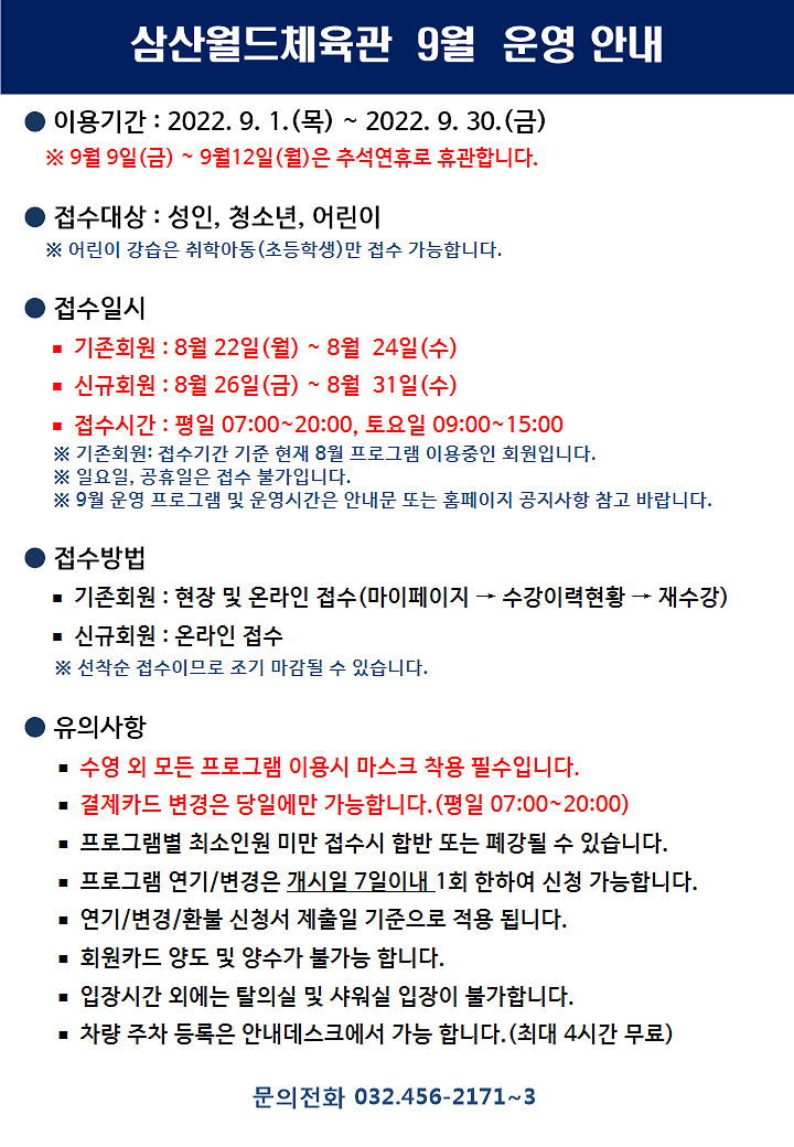 삼산월드체육관 9월 운영안내