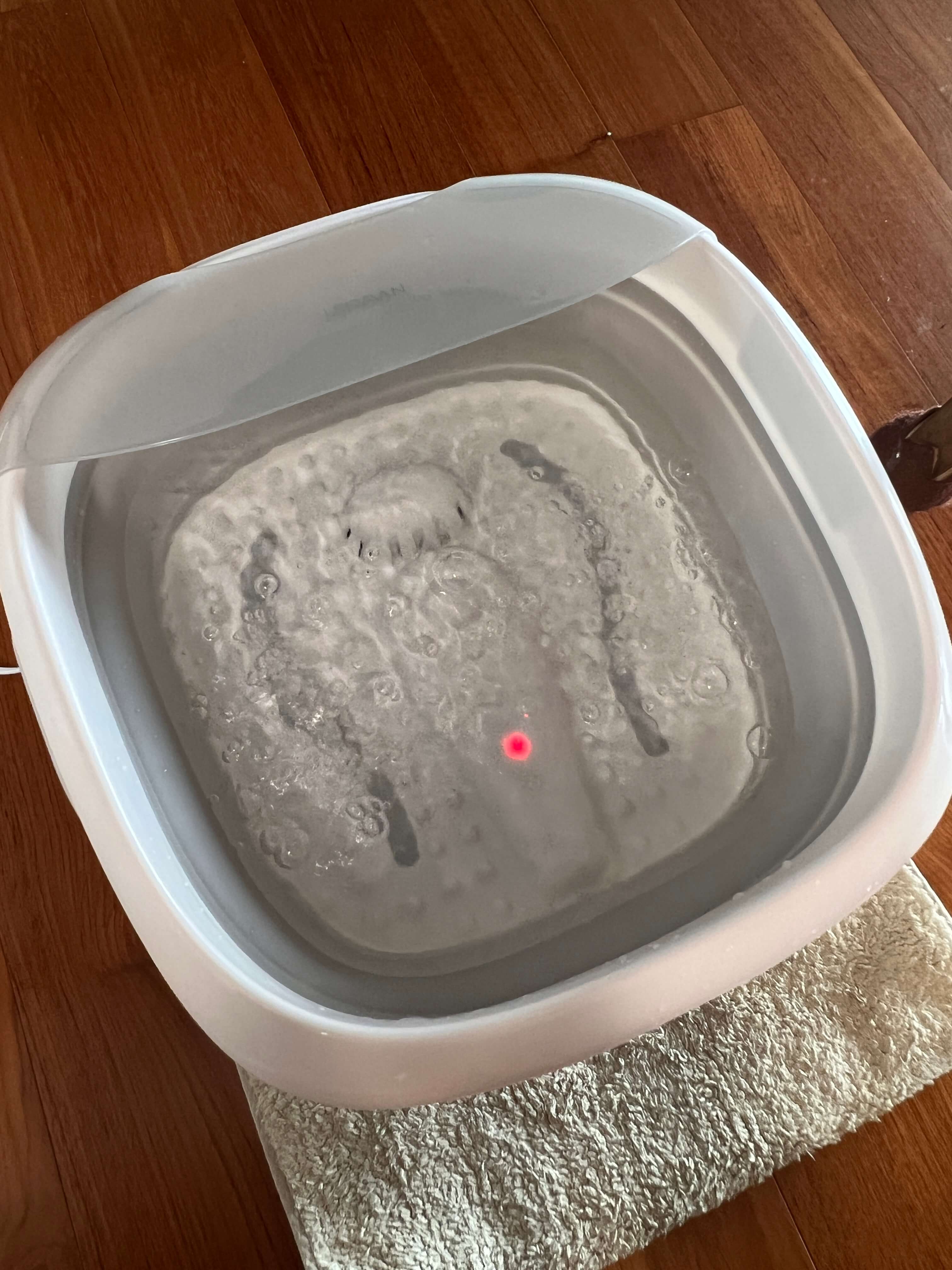 실제 작동되는 모습을 한번 보여드릴게요. 전원을 한번 누르면 빨간 불이 들어오고 물의 온도만 올라가게 됩니다. 소음은 전혀 없고 물의 온도만 서서히 올라가는데, 앞서 말씀드렸지만 온도조절 기능이 따로 없기 때문에 뜨겁다 싶으면 전원을 끄셔야 한답니다.