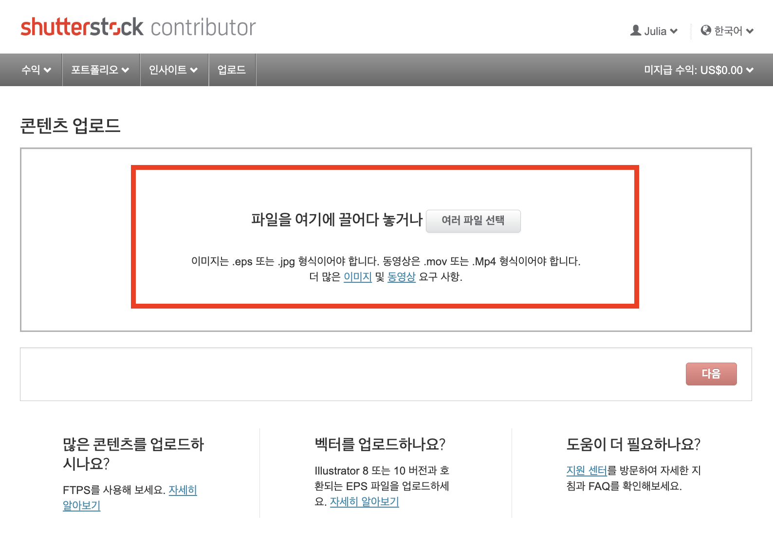 셔터스톡에 접속하여 가입을 하게 되면 자신이 찍은 사진을 업로드할 수 있습니다. 사진을 업로드 하는 방법은 크게 어렵지 않습니다. 가입하신 후에 [콘텐츠 업로드]란에 가셔서 업로드 하고싶은 파일을 선택하여 끌어다 놓은 후, 업로드하면 됩니다.