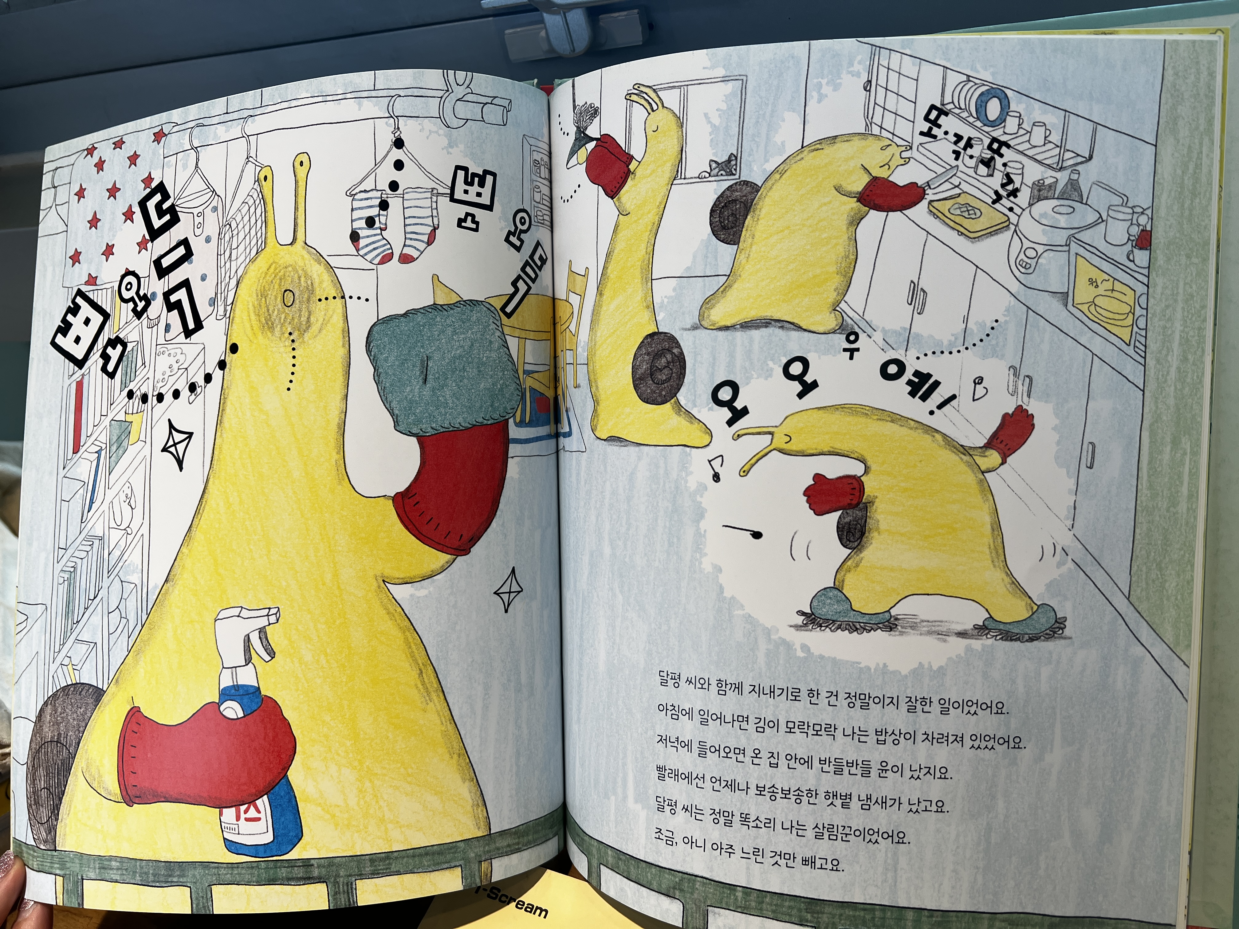 우연이 콩이네 집으로 오게 된 달평씨 덕분에 콩이네 집에는 평화가 찾아옵니다. 바로 달평씨의 대단한 살림솜씨 때문이었는데요. 달평씨는 요리도 잘하고 청소도 잘하고 빨래도 잘하는 만능 달팽이입니다. 달평씨 덕분에 엄마도 아빠도 생활의 변화를 일으킵니다. 조금씩 돕고 치우고 위해주는 마음 덕분에 콩이도 행복해집니다.