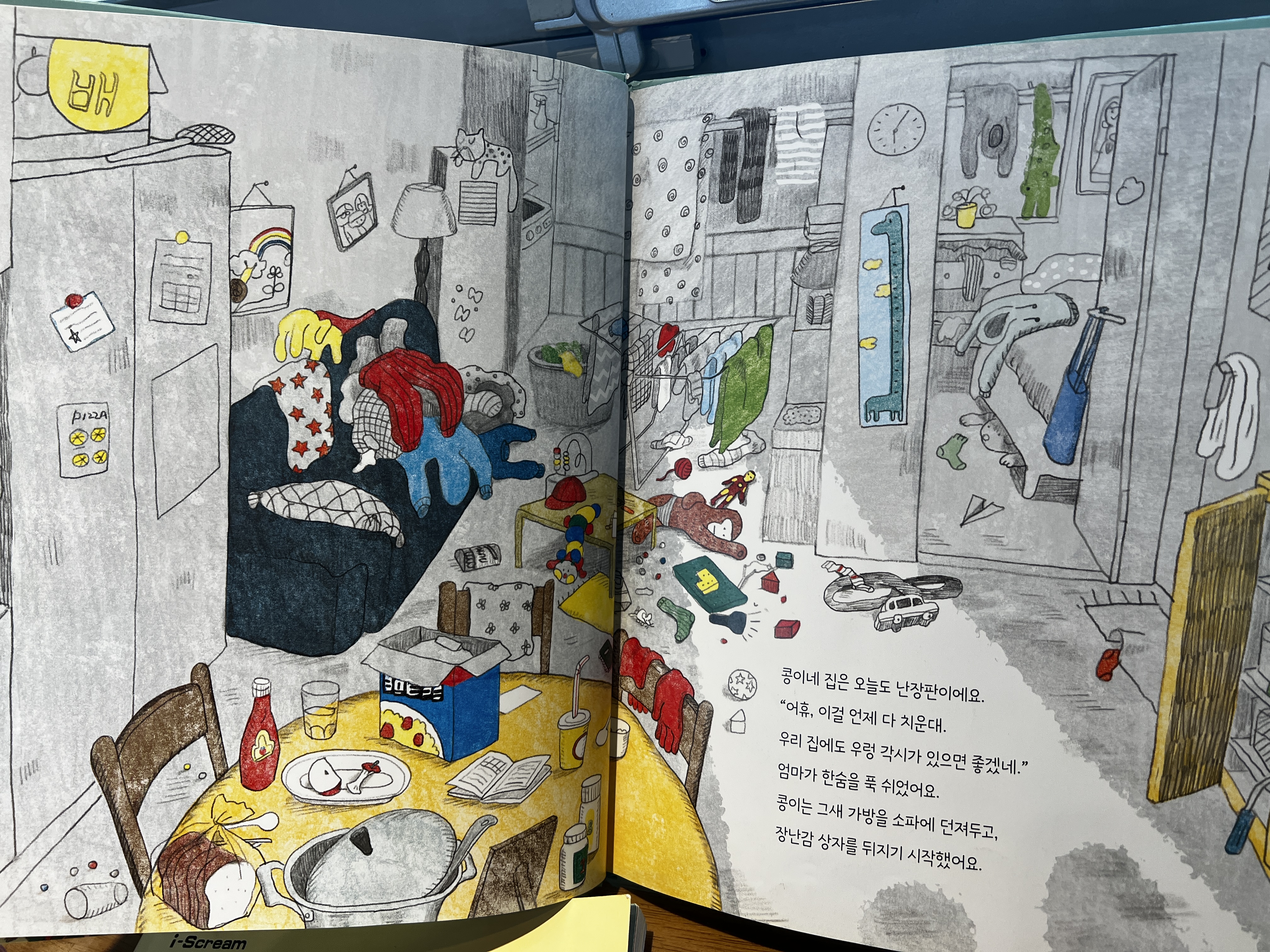 엄마와 아빠가 맞벌이를 하시는 콩이네 집 사정은 이렇습니다. 피곤한 엄마아빠는 정리정돈이 힘들죠. 사실 정말 격하게 공감합니다. 저희집에서는 제가 주로 청소와 빨래 등등의 집안일을 담당하고 있는데, 제때제때 치우지 않으면 순식간에 집안은 엉망진창이 되곤 하니까요. 이야기 속의 엄마는 '우렁 각시'가 있었으면 좋겠다고 이야기합니다(순간 아빠는??? 하는 생각이 불쑥).