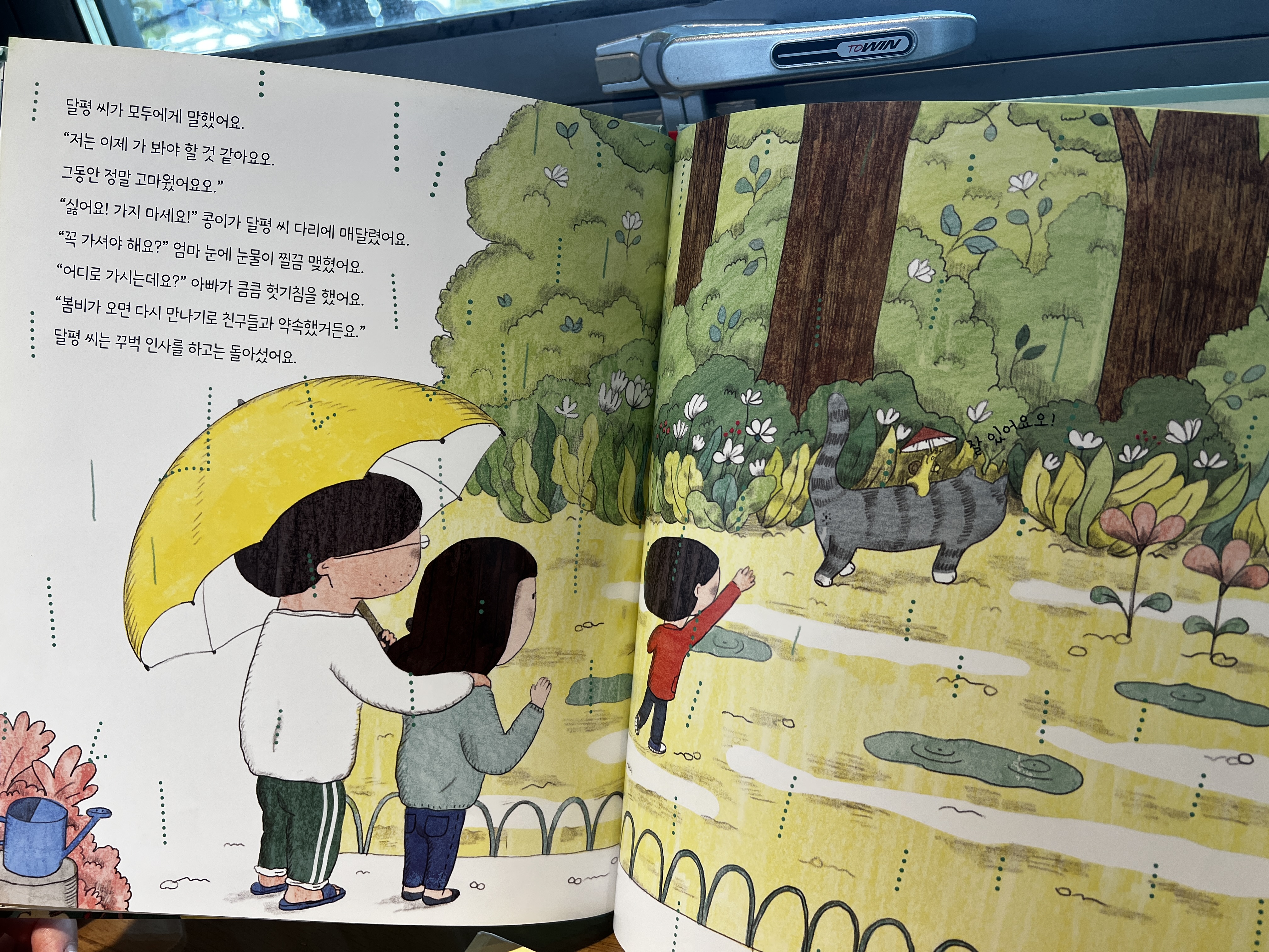 만남이 있다면 헤어짐도 있는 법이죠. 평생을 함께 살면 좋으련만 달평씨는 봄비가 오면 만나기로 했다는 친구들을 찾아 어느날 떠나갑니다. 너무 슬퍼서 눈물이 왈칵 날 뻔 했어요. 우리집에도 달평씨가 있다면 저도 가끔은 커피한잔 마시면서 좋아하는 책장을 넘길 시간이 생길 수 있을 것 같은데 말입니다.